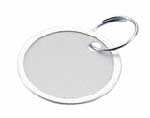 A COMPACT TRANSPARENT TAG. (7/8" X 2-1/4") THAT IS IDEAL FOR KEYS OR LUGGAGE. 6 ASSORTED COLORS: CLEAR, BLUE, GREEN, RED, ORANGEM AND YELLOW WITH A PAPER INSERT FOR IDENTIFYING INFORMATION AND A HEAVY-DUTY 4-1/2" NICKEL-PLATED STEEL BALL CHAIN.