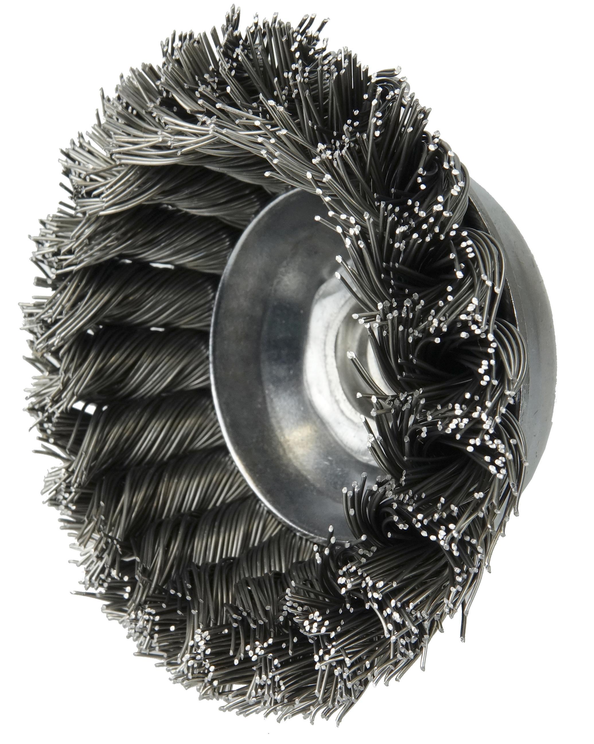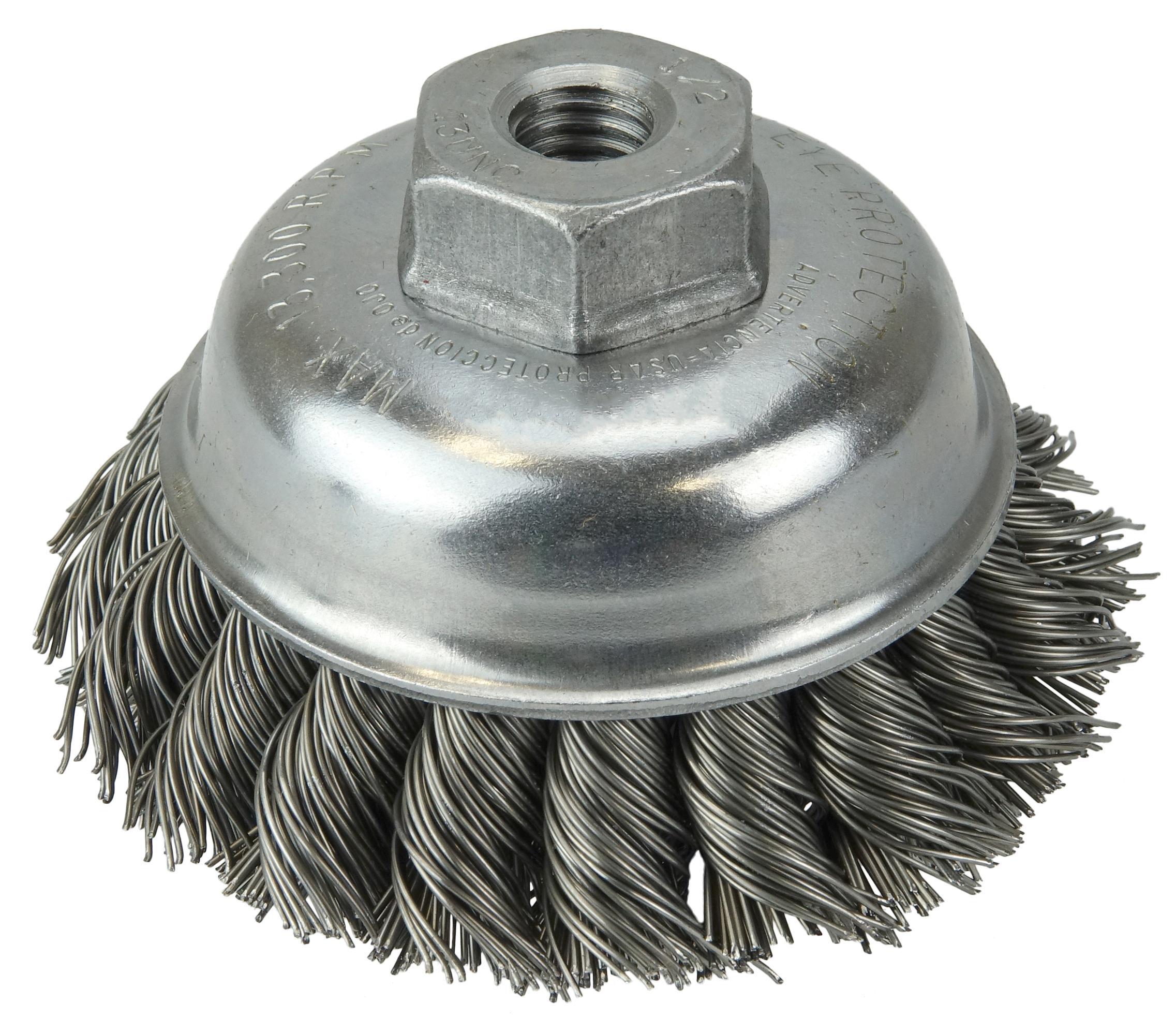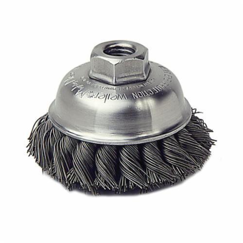 Weiler® 13155 Single Row Cup Brush, 3-1/2 in Dia Brush, 1/2-13 UNC Arbor Hole, 0.023 in Dia Filament/Wire, Standard/Twist Knot, Steel Fill