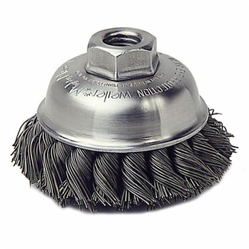 Weiler® 13151 Single Row Cup Brush, 3-1/2 in Dia Brush, M10x1.5 Arbor Hole, 0.023 in Dia Filament/Wire, Standard/Twist Knot, Steel Fill