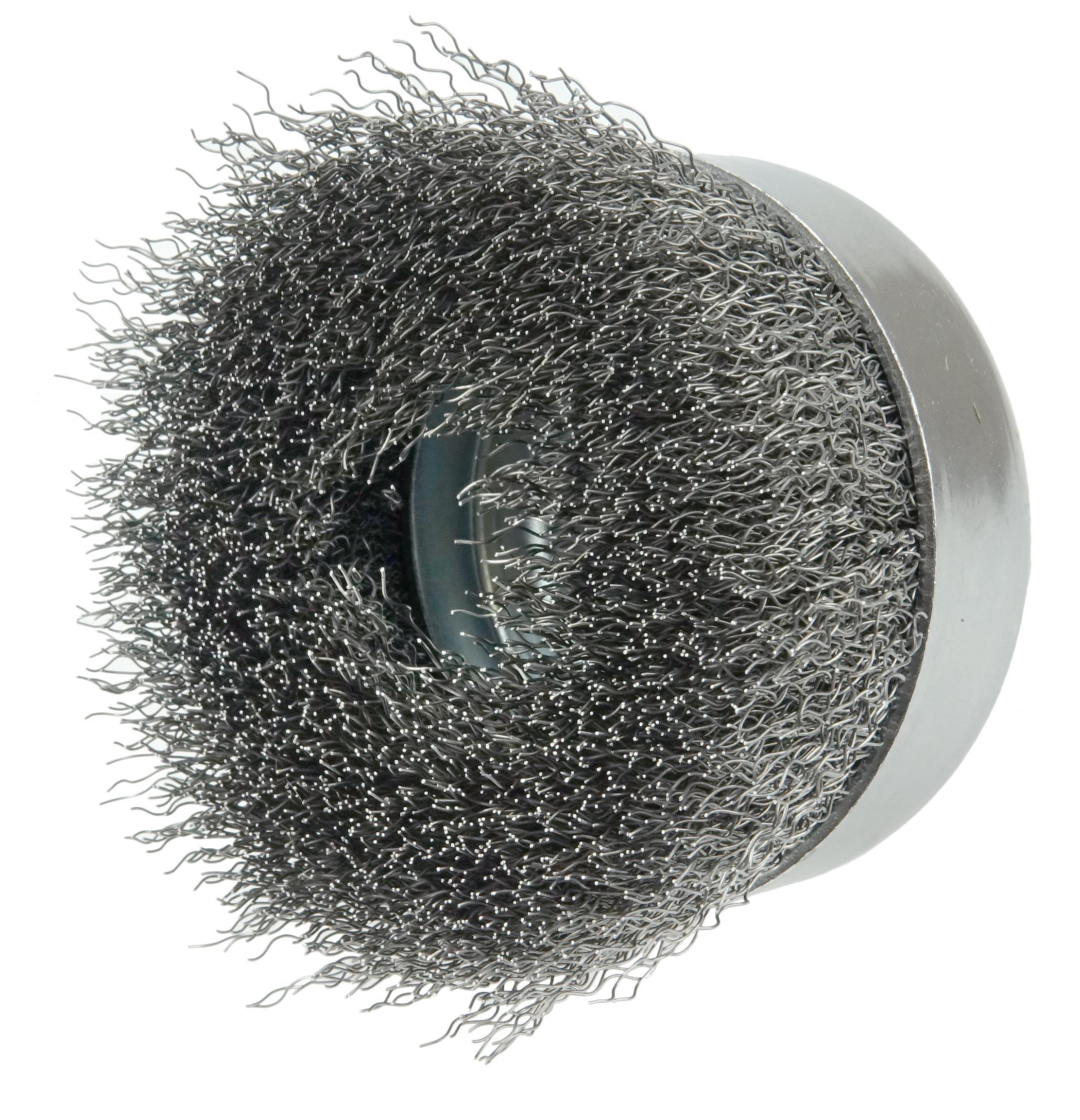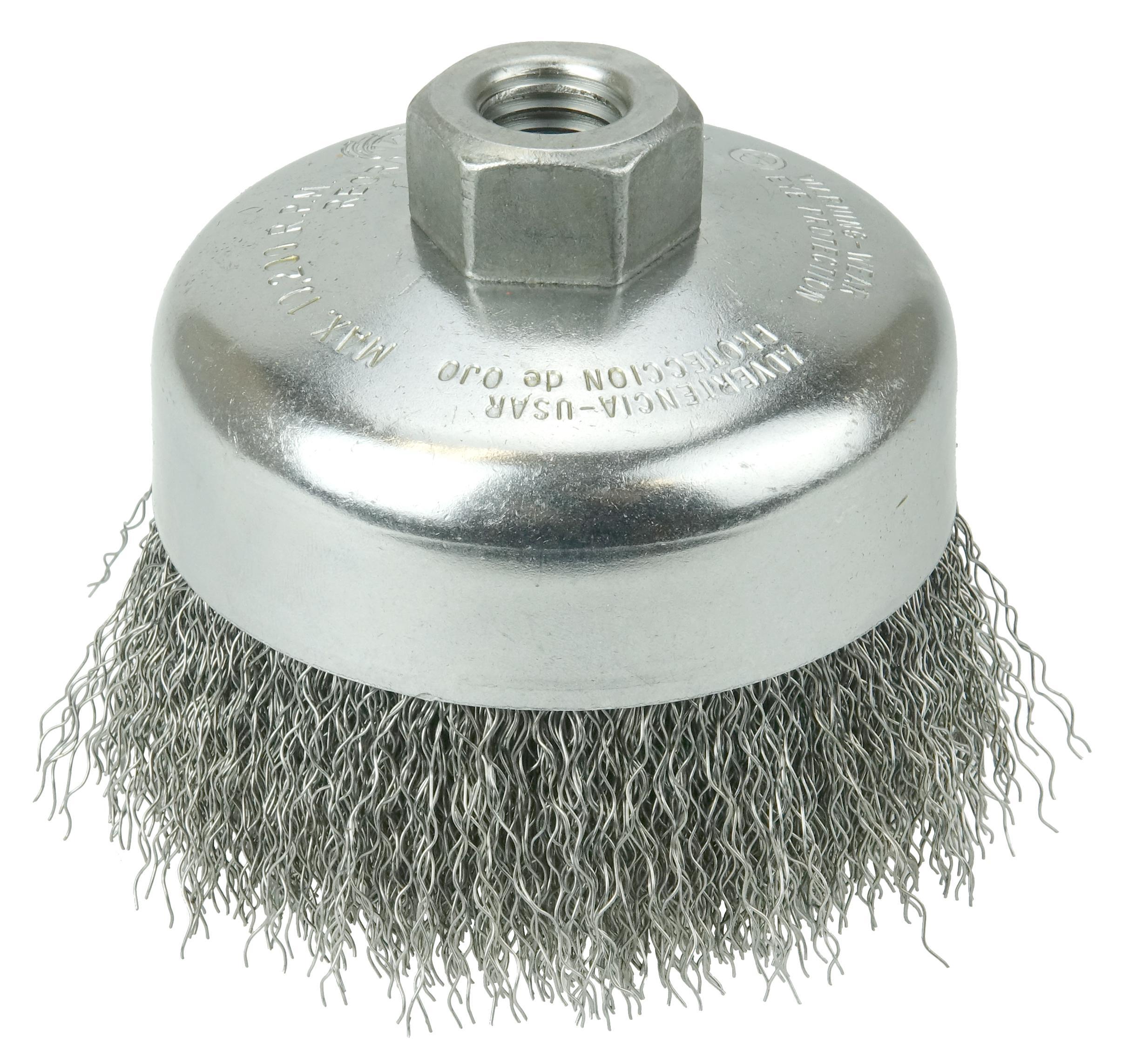 Weiler® 14026 Cup Brush, 4 in Dia Brush, 5/8-11 UNC Arbor Hole, 0.014 in Dia Filament/Wire, Crimped, Steel Fill