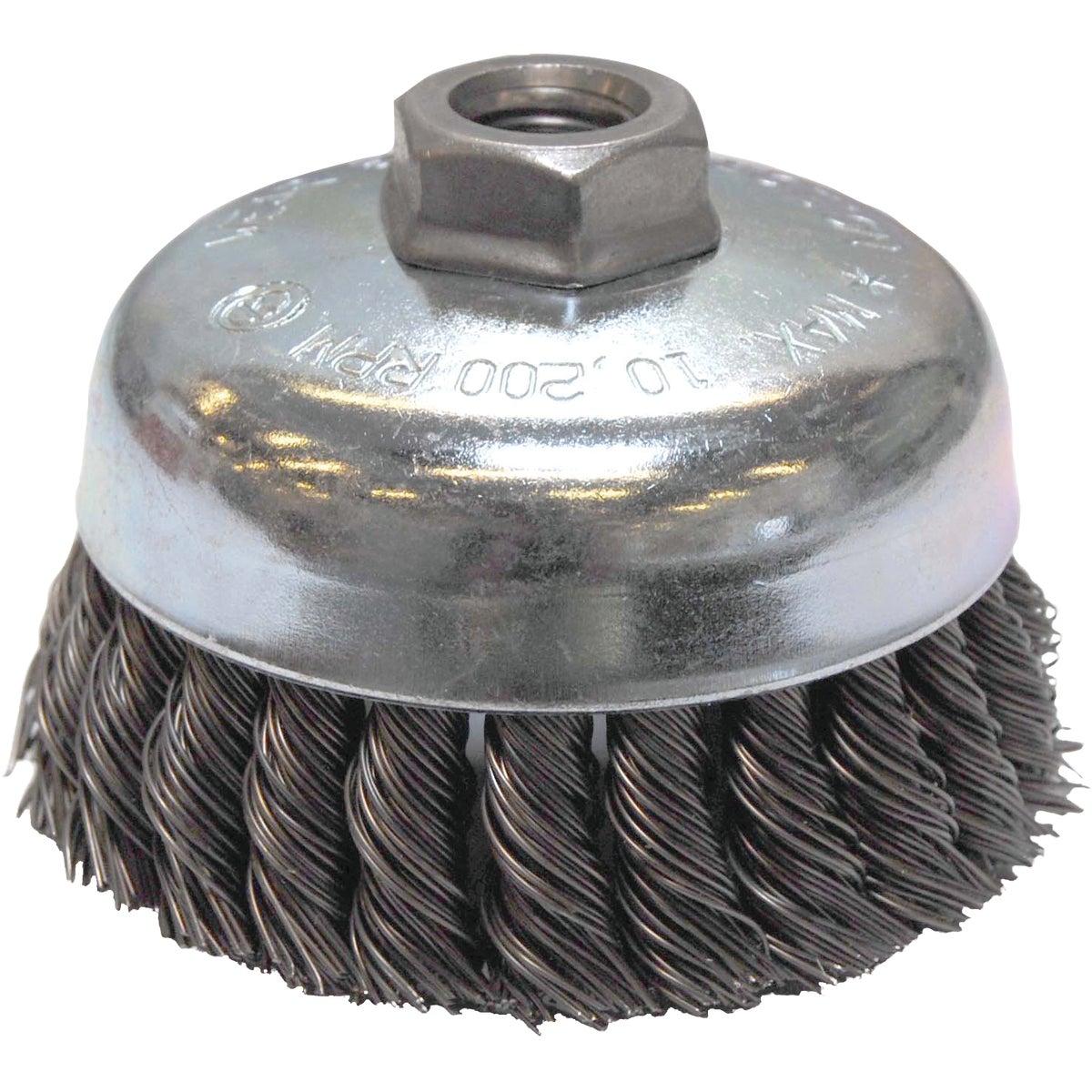 Vortec Pro® 36044 Single Row Cup Brush, 4 in Dia Brush, 5/8-11 UNC Arbor Hole, 0.025 in Dia Filament/Wire, Standard/Twist Knot, Carbon Steel Fill