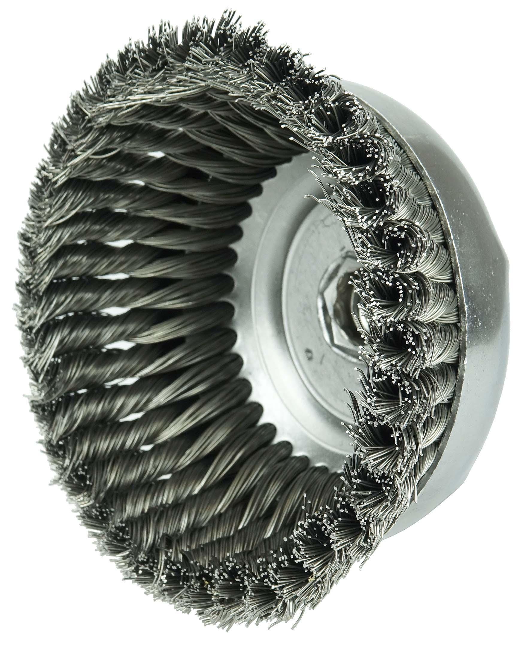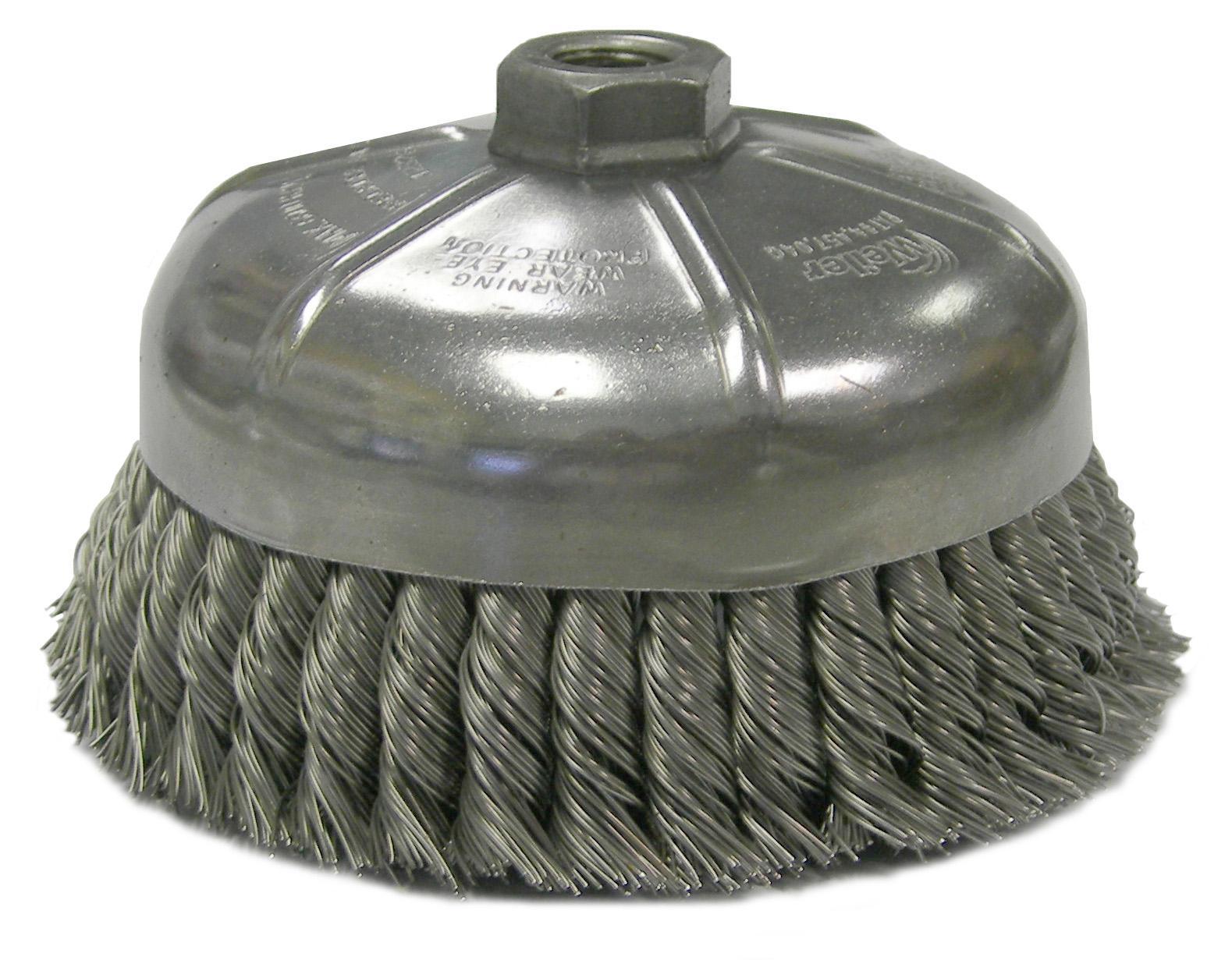 Weiler® 12376 Single Row Cup Brush, 6 in Dia Brush, 5/8-11 UNC Arbor Hole, 0.023 in Dia Filament/Wire, Standard/Twist Knot, Steel Fill