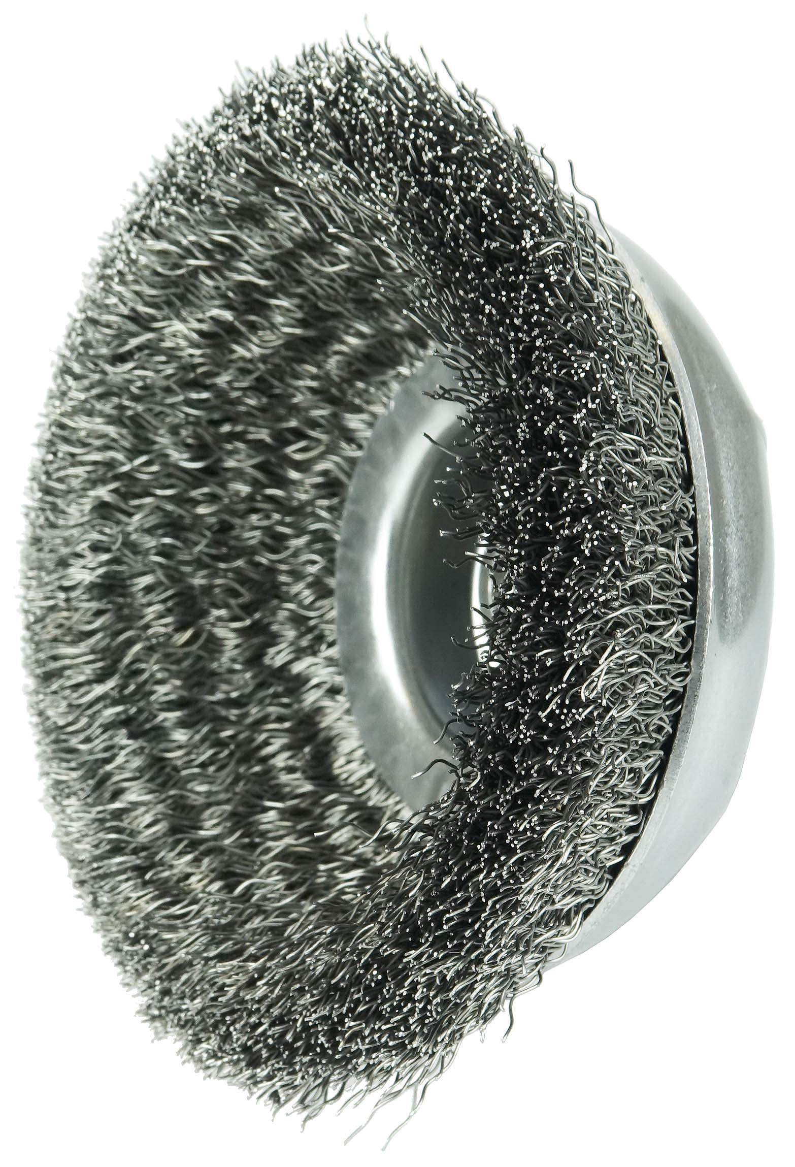 Weiler® 14076 Internal Nut Cup Brush, 6 in Dia Brush, 5/8-11 UNC Arbor Hole, 0.02 in Dia Filament/Wire, Crimped, Steel Fill