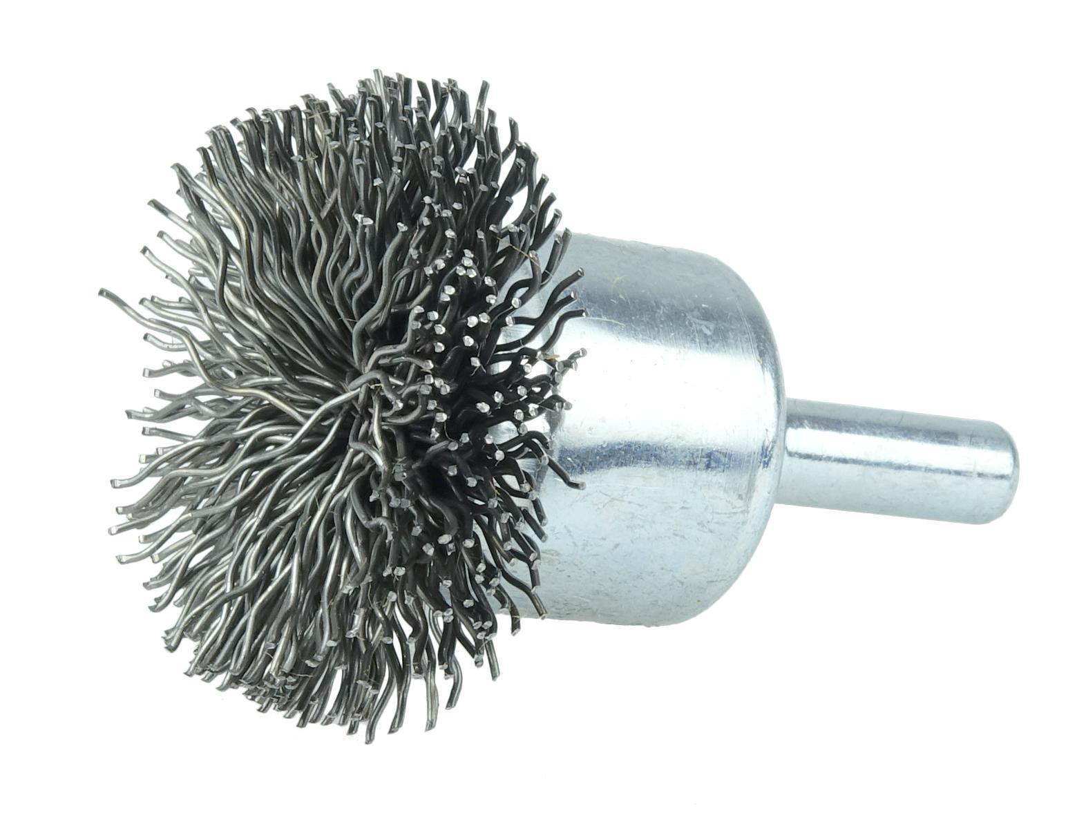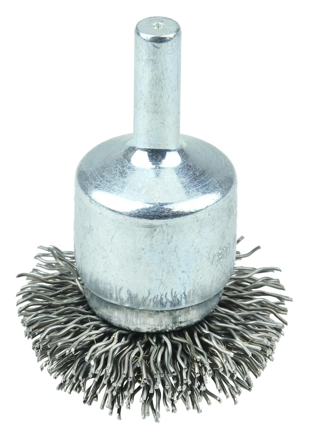 Weiler® 10038 Circular Flared Stem Mount End Brush, 1-1/2 in Dia Brush, Crimped, 0.02 in Dia Filament/Wire, Steel Fill, 7/8 in L Trim