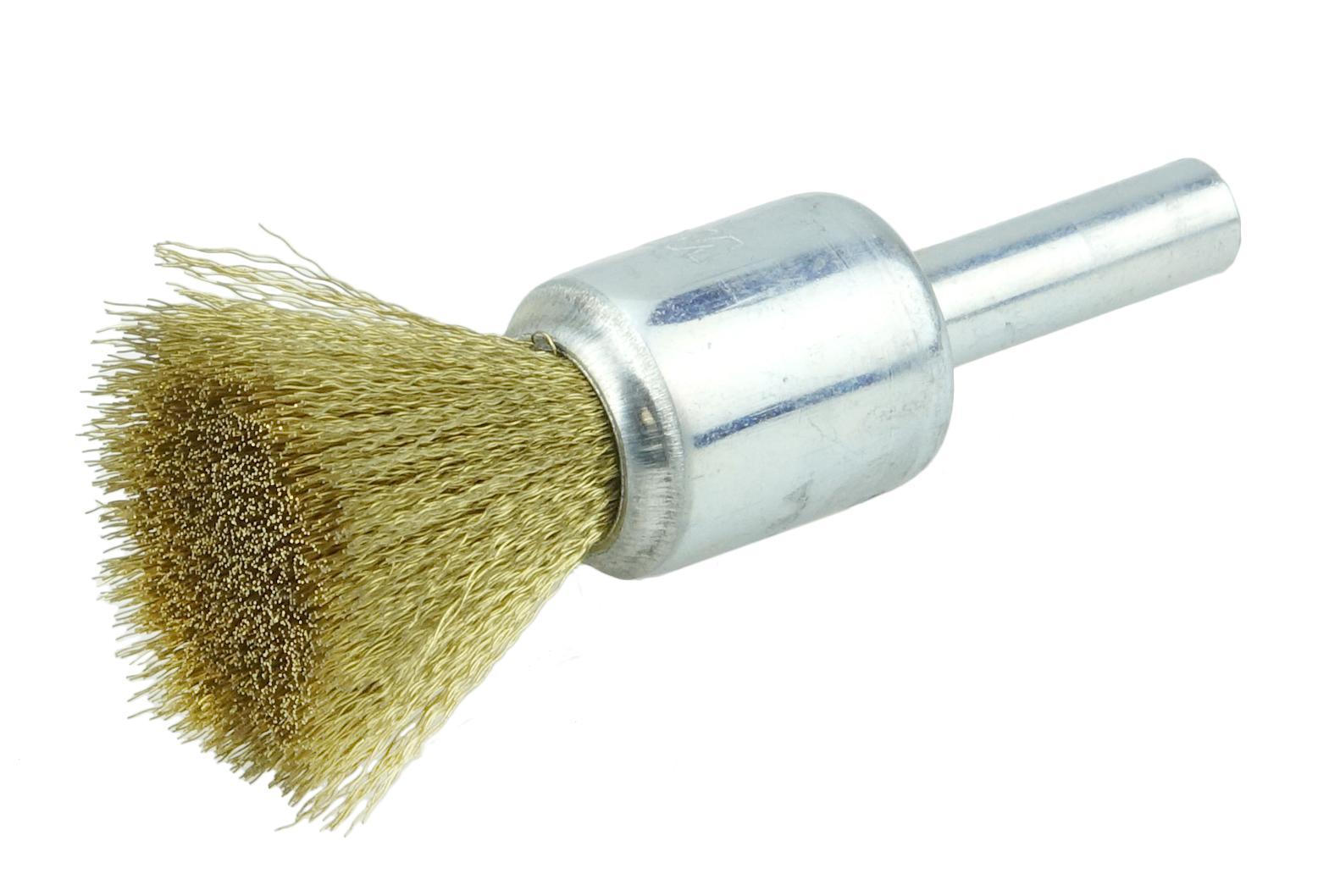 Weiler® 10158 Stem Mount End Brush, 1/2 in Dia Brush, Crimped, 0.005 in Dia Filament/Wire, Brass Fill, 7/8 in L Trim
