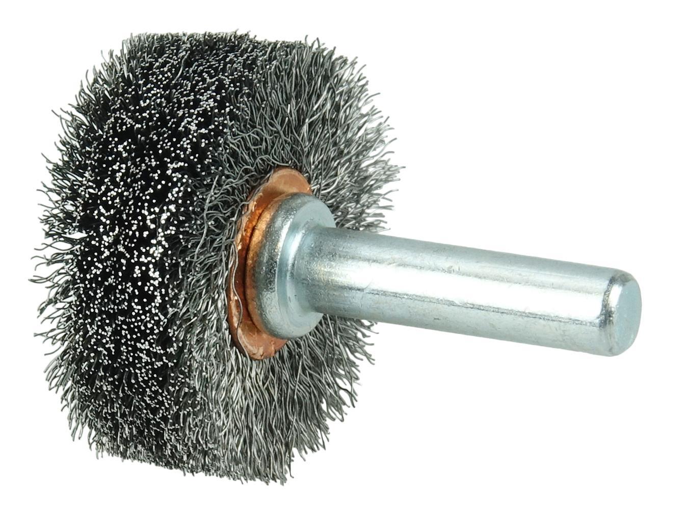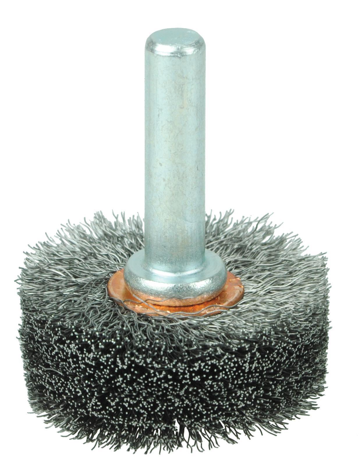 Weiler® 17263 Small Diameter Wheel Brush, 3 in Dia Brush, 3/8 in W Face, 0.016 in Dia Crimped Filament/Wire, 1/2 in Arbor Hole