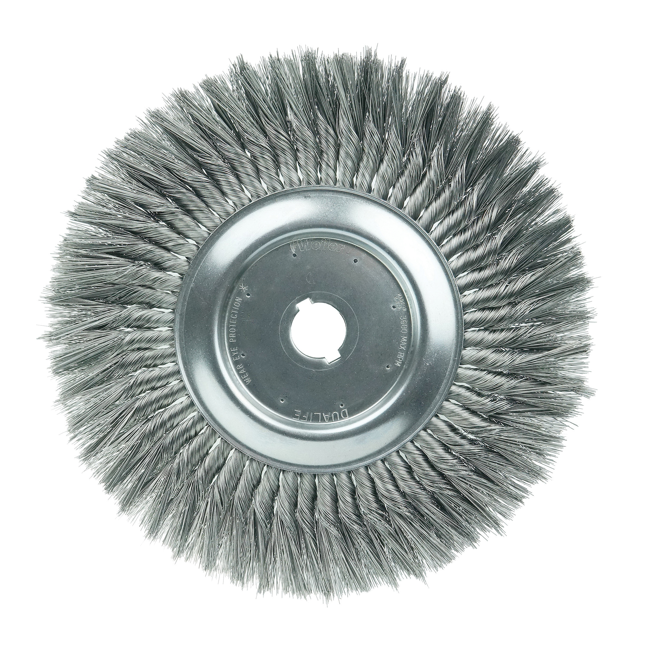 Weiler® 12 in standard twist knot wire Wheel Brush provides a heavy duty brushing action with some flexibility for demanding deburring cleaning and surface preparation applications on somewhat irregular surfaces. Featuring Weiler® individual knot hole construction, these radial brushes are available in heat treated steel, type 302 stainless steel and bronze wire for use in a wide variety of applications. 1-1/4 in arbor hole for use on bench/pedestal grinder, die grinder, right angle die grinder and straight grinders.