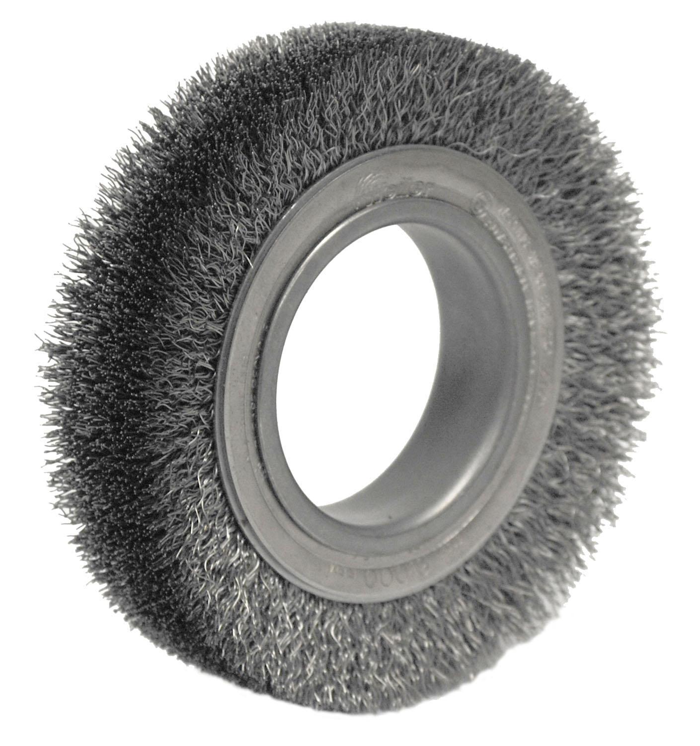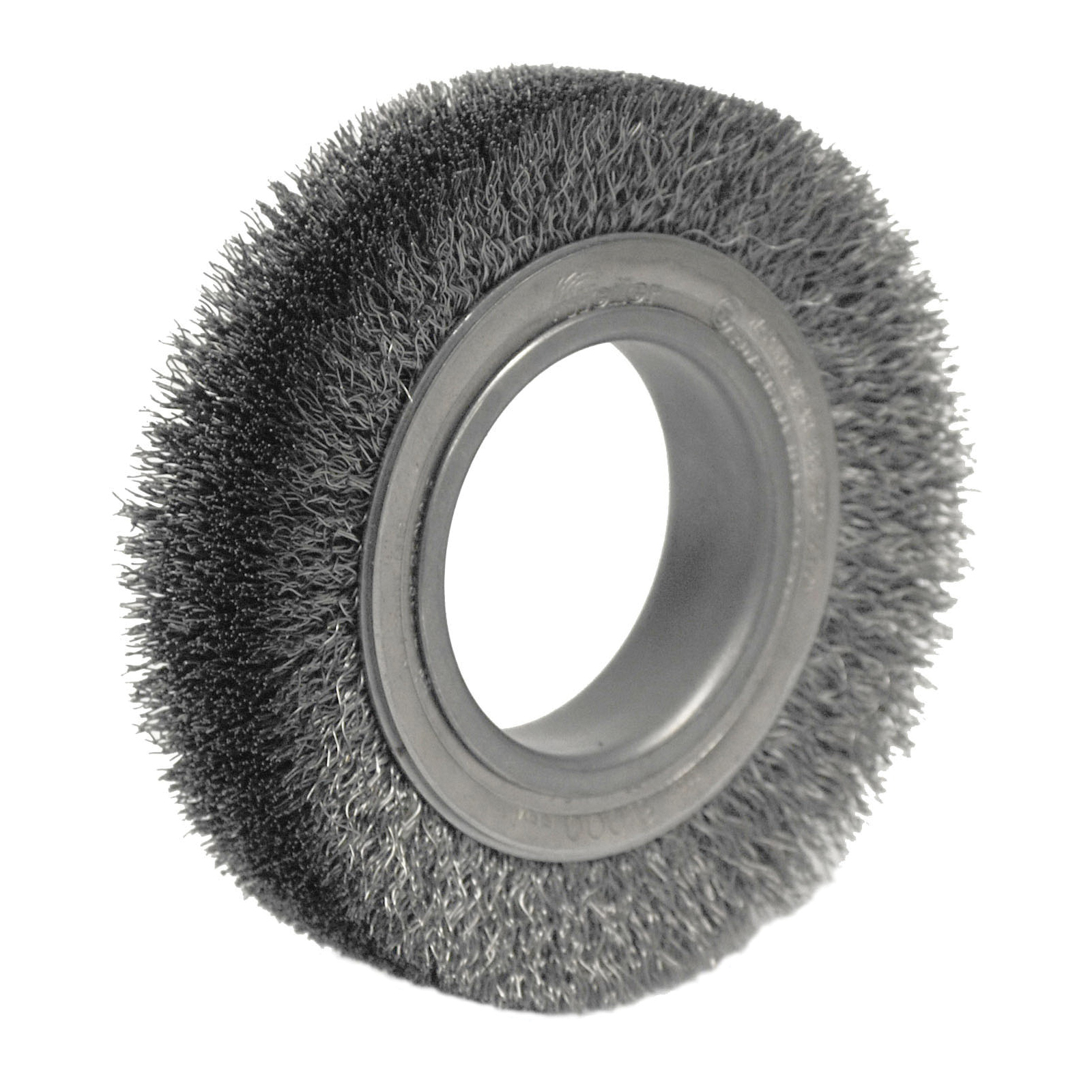 Weiler® 4-1/2 in medium face crimped wire wheel provide a flexible brushing action and consistent performance for demanding light duty cleaning and deburring applications on steel, armored steel, cast iron, ductile iron and tool steel parts. Featuring Weiler® solid ring construction, these radial brushes are available in heat treated steel, type 302 stainless steel and brass wire. 2 in arbor hole for use on CNC/milling/automatic machine, bench/pedestal and straight grinders.
