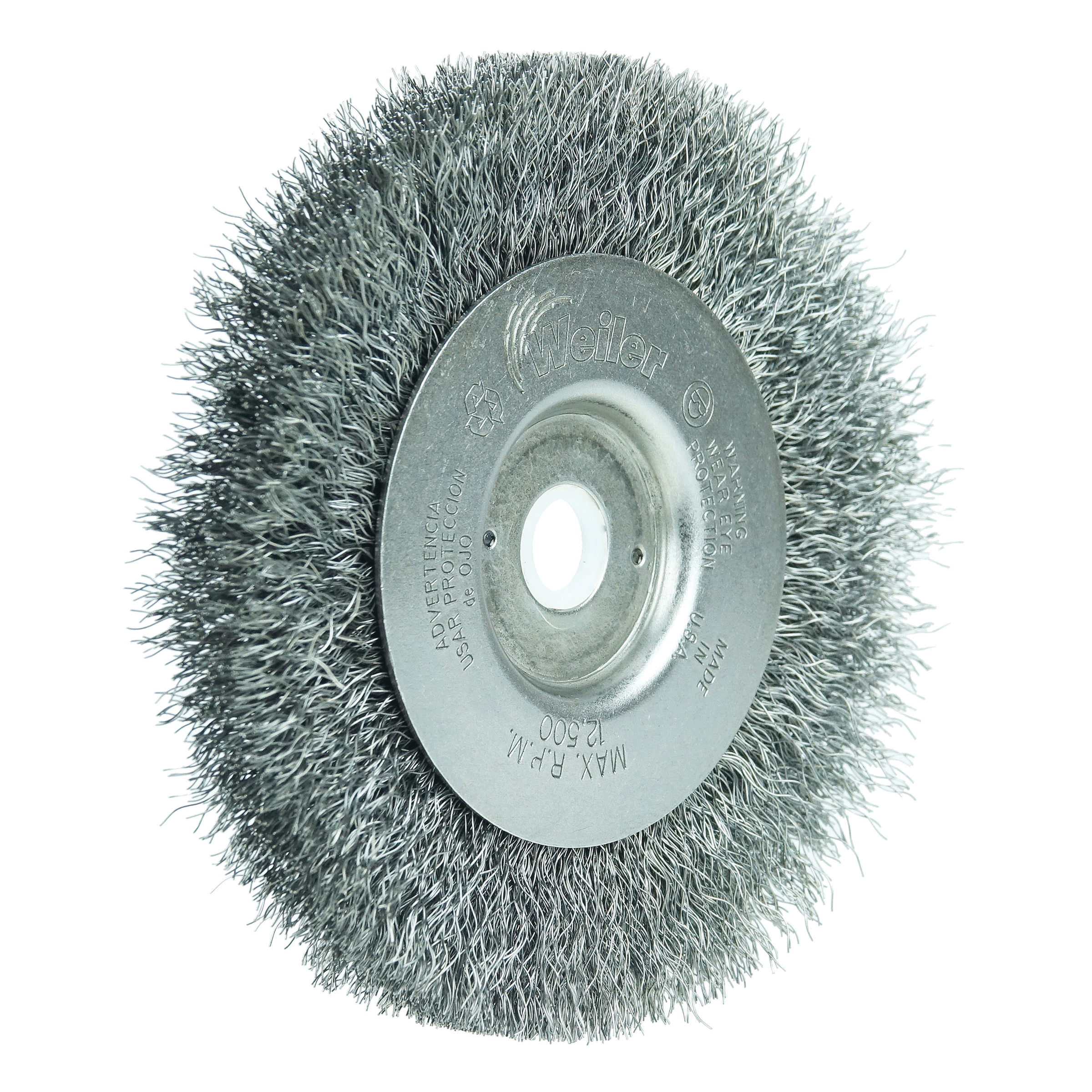 Weiler® 8 in medium face crimped wire wheel provide a flexible brushing action and consistent performance for demanding light duty cleaning and deburring applications on stainless steel, aluminum, brass, bronze, copper, high nickel alloys, Inconel, pewter, platinum and titanium part parts. Featuring Weiler® solid ring construction, these radial brushes are available in heat treated steel, type 302 stainless steel and brass wire. 2 in arbor hole for use on CNC/milling/automatic machine, bench and pedestal grinders.