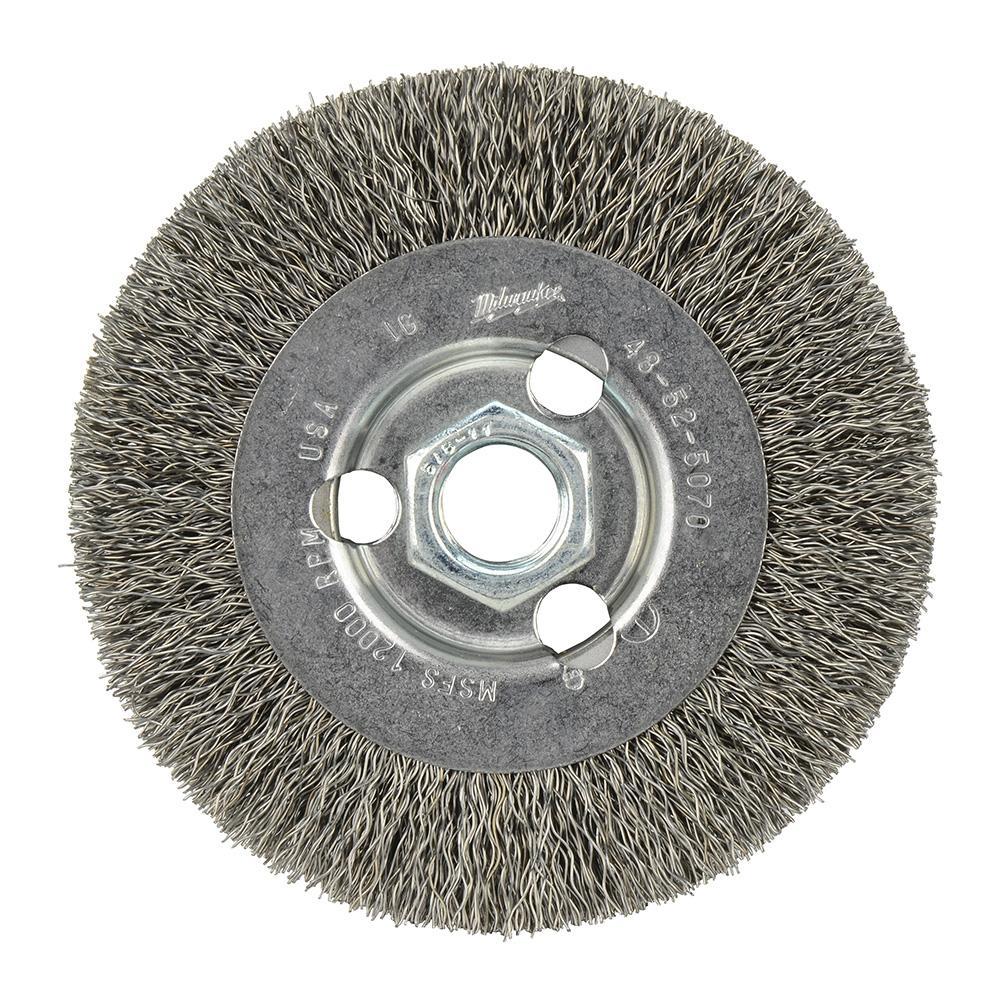Milwaukee Hyperwire™ wire brush products offer faster material removal and greater life yet maintain a finer finish. The crimped wire brush is suited for general purpose surface cleaning and conditioning. Milwaukee offers crimped wire wheels in both carbon and stainless steel. The brush is designed for use on 4-1/2 or 5 in. Milwaukee and competitive grinders with 5/8 - 11 threaded spindles. Made of carbon steel.