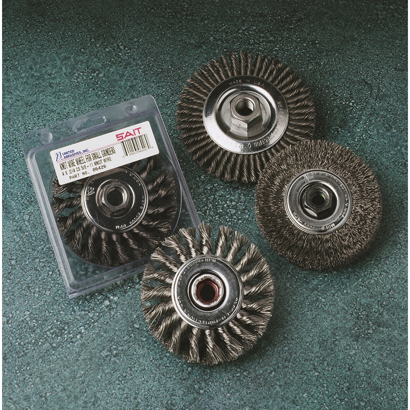 United Abrasives-SAIT 03426 Wheel Brush, 4 in Dia Brush, 1/2 in W Face, 0.014 in Dia Regular Twist Filament/Wire, 5/8-11 Arbor Hole