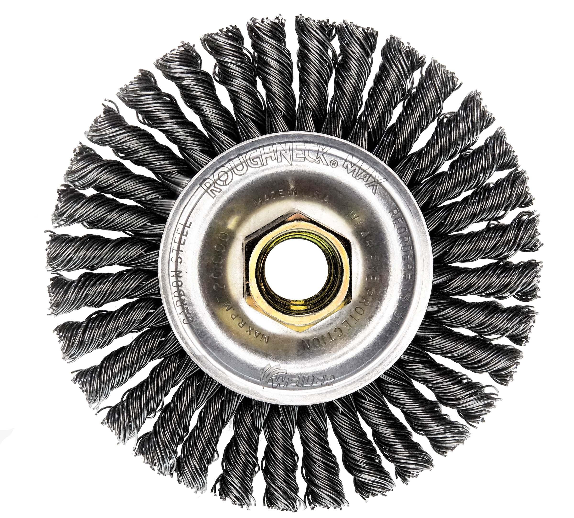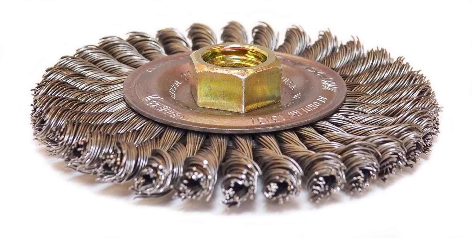 Weiler® 13131 Narrow Face Wheel Brush With Nut, 4 in Dia Brush, 3/16 in W Face, 0.02 in Dia Stringer Bead Knot Filament/Wire, 5/8-11 Arbor Hole
