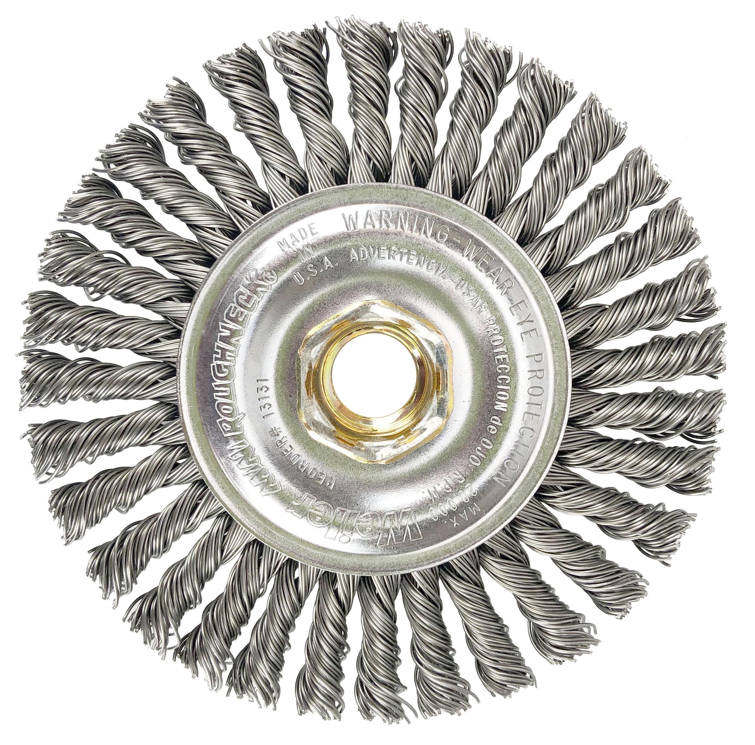 Roughneck Max 13131 Narrow Face Wheel Brush, 4 in Dia Brush, 3/16 in W Face, 0.02 in Dia Stringer Bead Knot Filament/Wire, 5/8-11 Arbor Hole