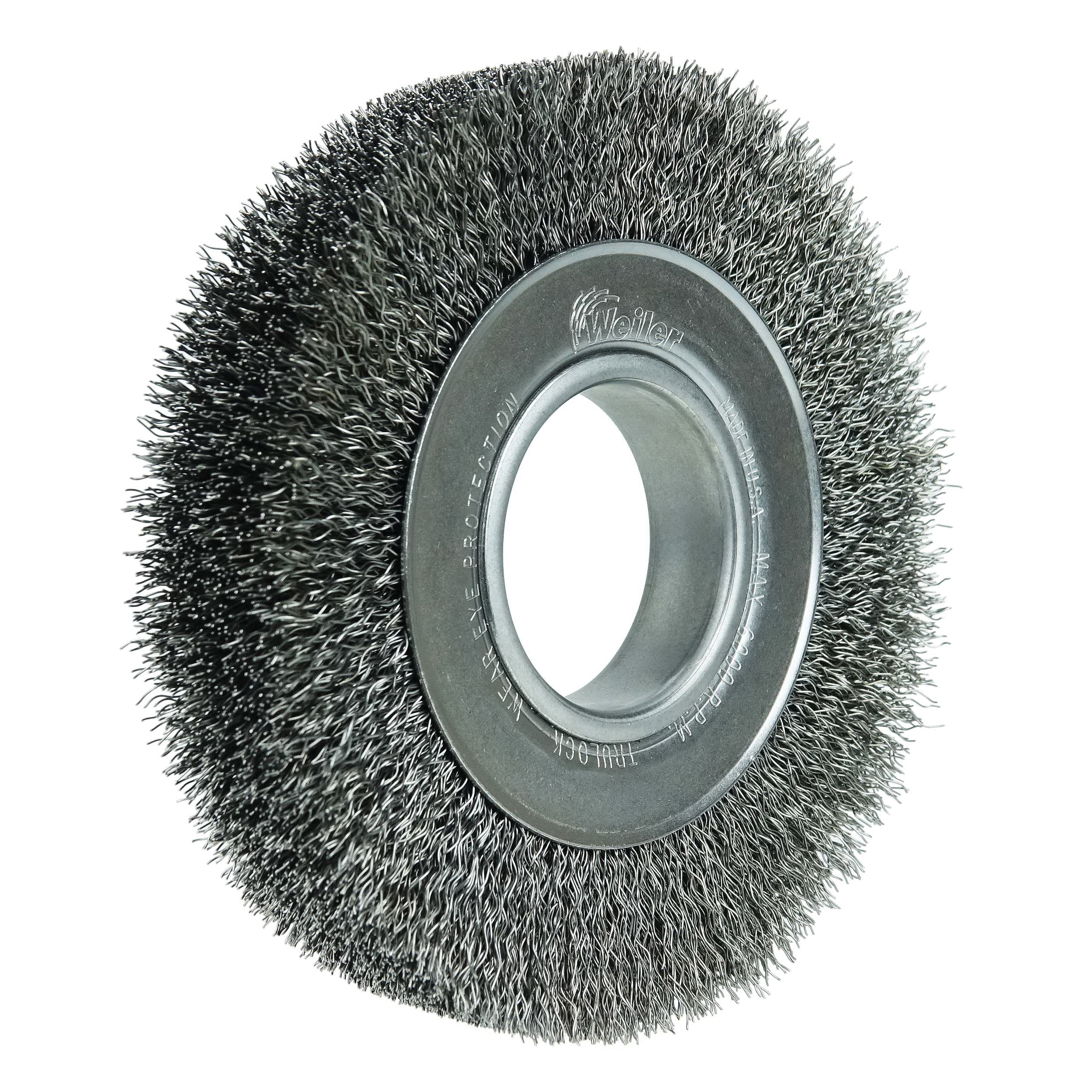 Weiler® 6 in standard twist knot wire Wheel Brush provides a heavy duty brushing action with some flexibility for demanding deburring cleaning and surface preparation applications on somewhat irregular surfaces. Featuring Weiler® individual knot hole construction, these radial brushes are available in heat treated steel, type 302 stainless steel and bronze wire for use in a wide variety of applications. 5/8 to 1/2 in arbor hole for use on bench/pedestal grinder, die grinder, right angle die grinder and straight grinders.