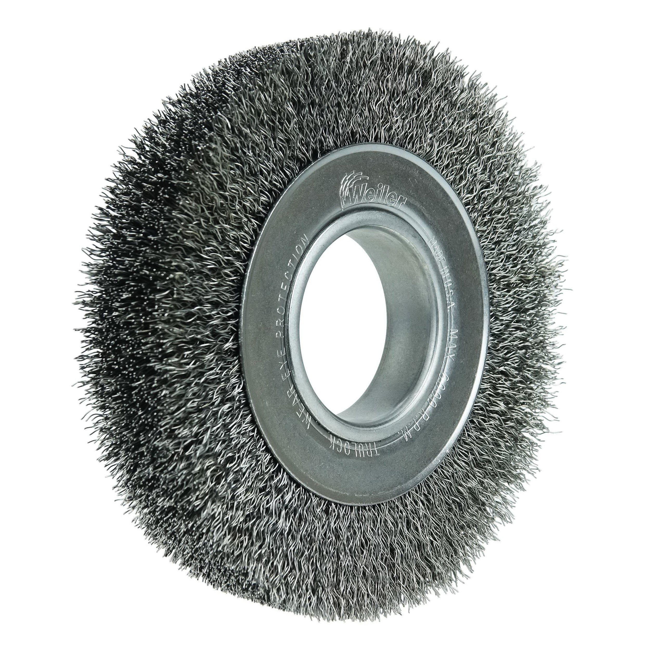 Weiler® 6 in wide face crimped wire wheel provide a flexible brushing action and consistent performance for demanding light duty cleaning and deburring applications on steel, armored steel, cast iron, ductile iron and tool steel parts. Maximum wire density and aggression and a wider face width to cover more area. 2 in arbor hole for use on CNC/milling/automatic machine, bench and pedestal grinders.