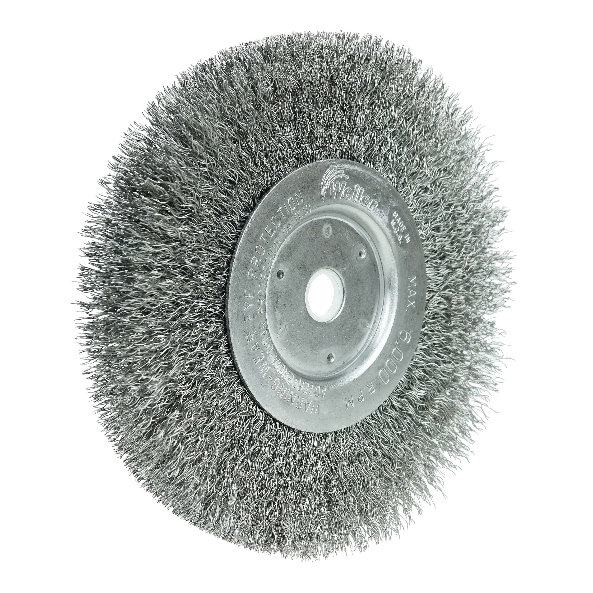 Weiler® 6 in narrow face crimped wire Wheel Brush provides a flexible brushing action and consistent performance for demanding light duty cleaning and deburring applications. Featuring Weiler® solid ring construction, these radial brushes are available in heat treated steel, type 302 stainless steel and brass wire for use in a wide variety of applications. 5/8 to 1/2 in arbor hole for use on bench/pedestal grinder, CNC/milling/automatic machines and straight grinders.