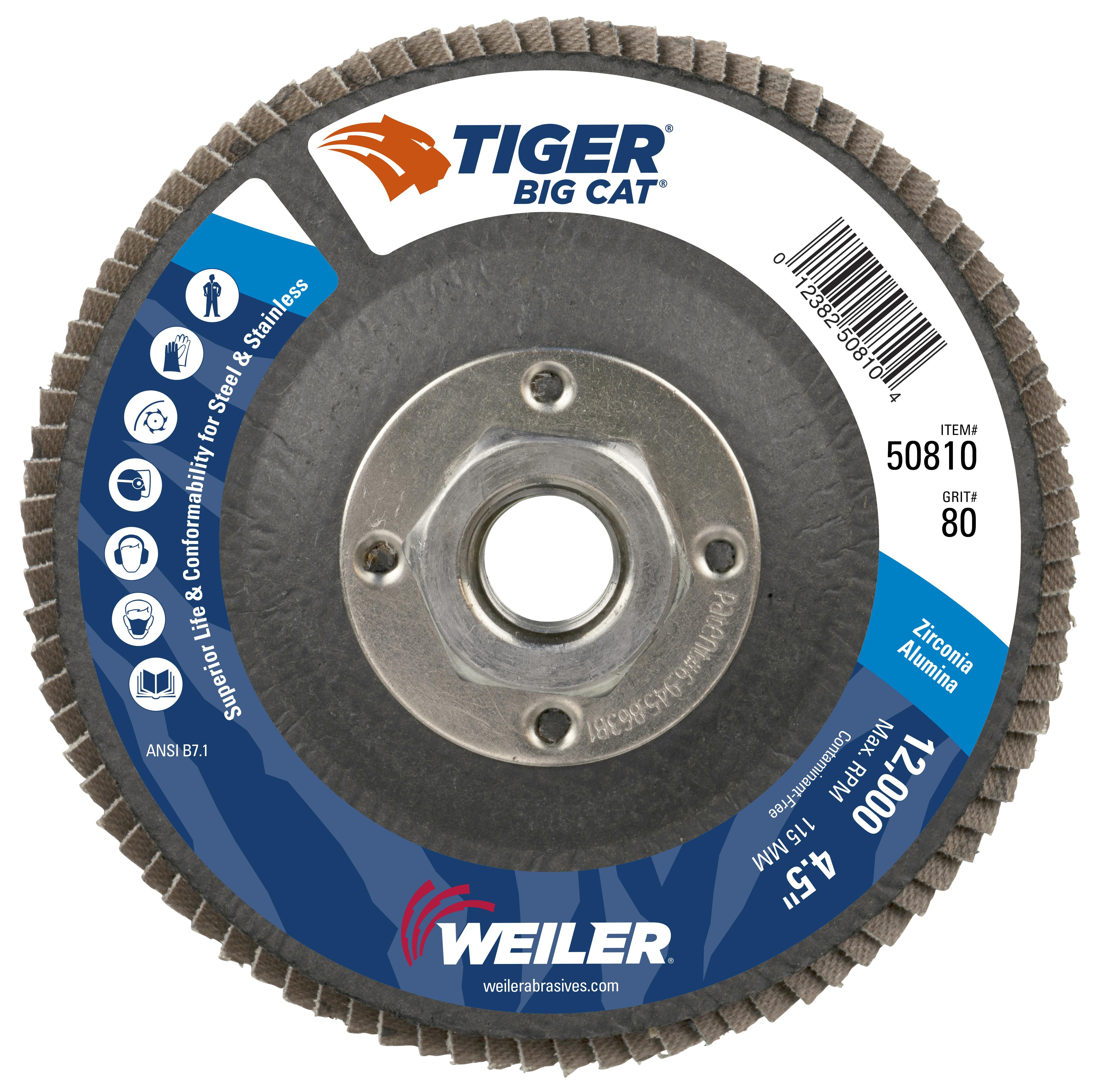 Big Cat® 50810 High Density Premium Coated Abrasive Flap Disc, 4-1/2 in Dia Disc, 80 Grit, Medium Grade, Zirconia Alumina Abrasive, Type 27 Flat Disc