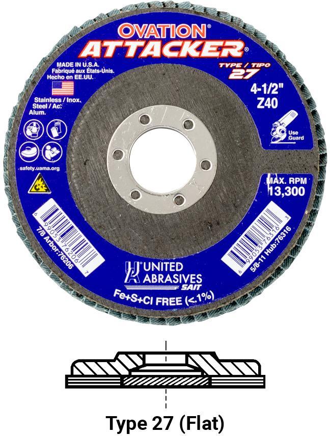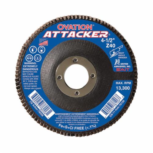 The United Abrasives/SAIT Ovation® Attacker® Flap Disc is contaminant free. Made with high performance zirconium grain, the Ovation® Attacker® Flap Disc is designed for a wide variety of grinding and finishing applications. Our Fiberglass backing will wear uniformly with abrasive cloth, will not splinter or smear on the workpiece. Lighter, quieter operation. Proudly manufactured in the USA.