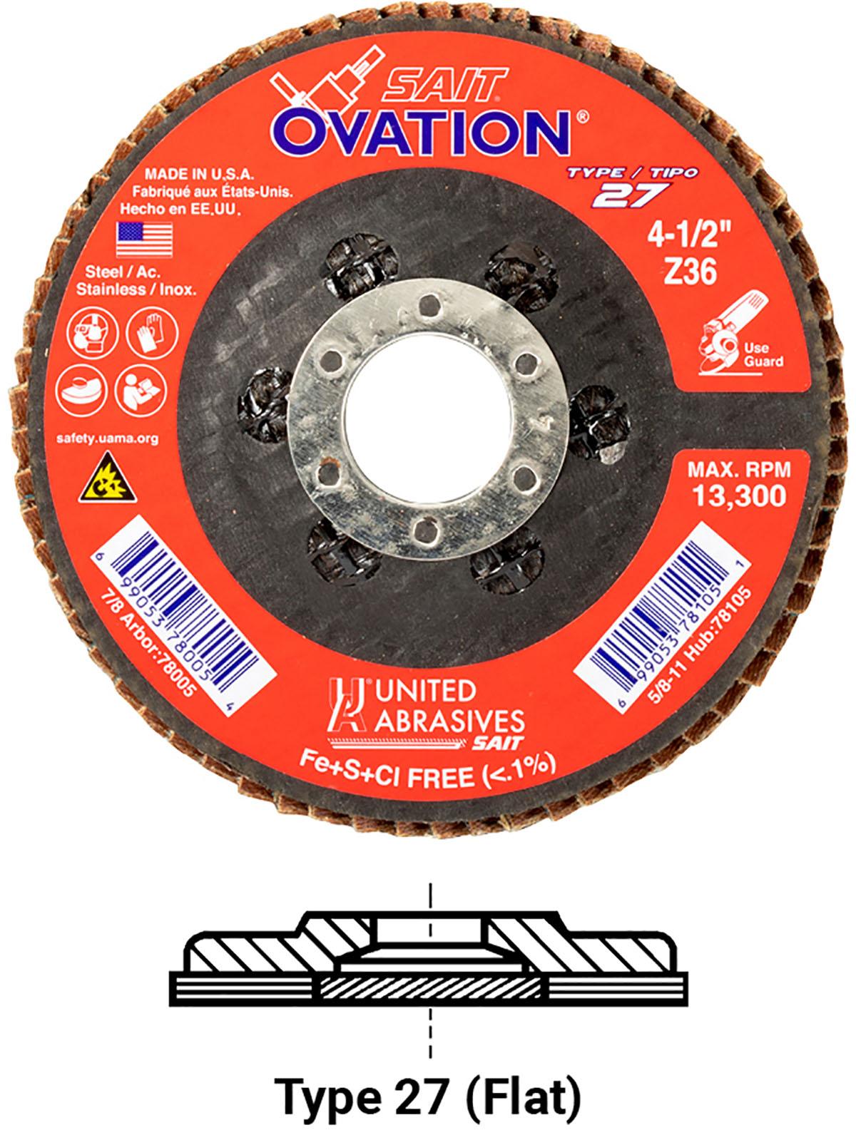 The United Abrasives/SAIT Ovation® Flap Disc is contaminant free. The Ovation® Flap Disc is made with heavy duty zirconium grain, designed for high pressure applications. Our fiberglass backing will wear uniformly with abrasive cloth, will not splinter or smear on the workpiece. Lighter, quieter operation. Proudly manufactured in the USA.