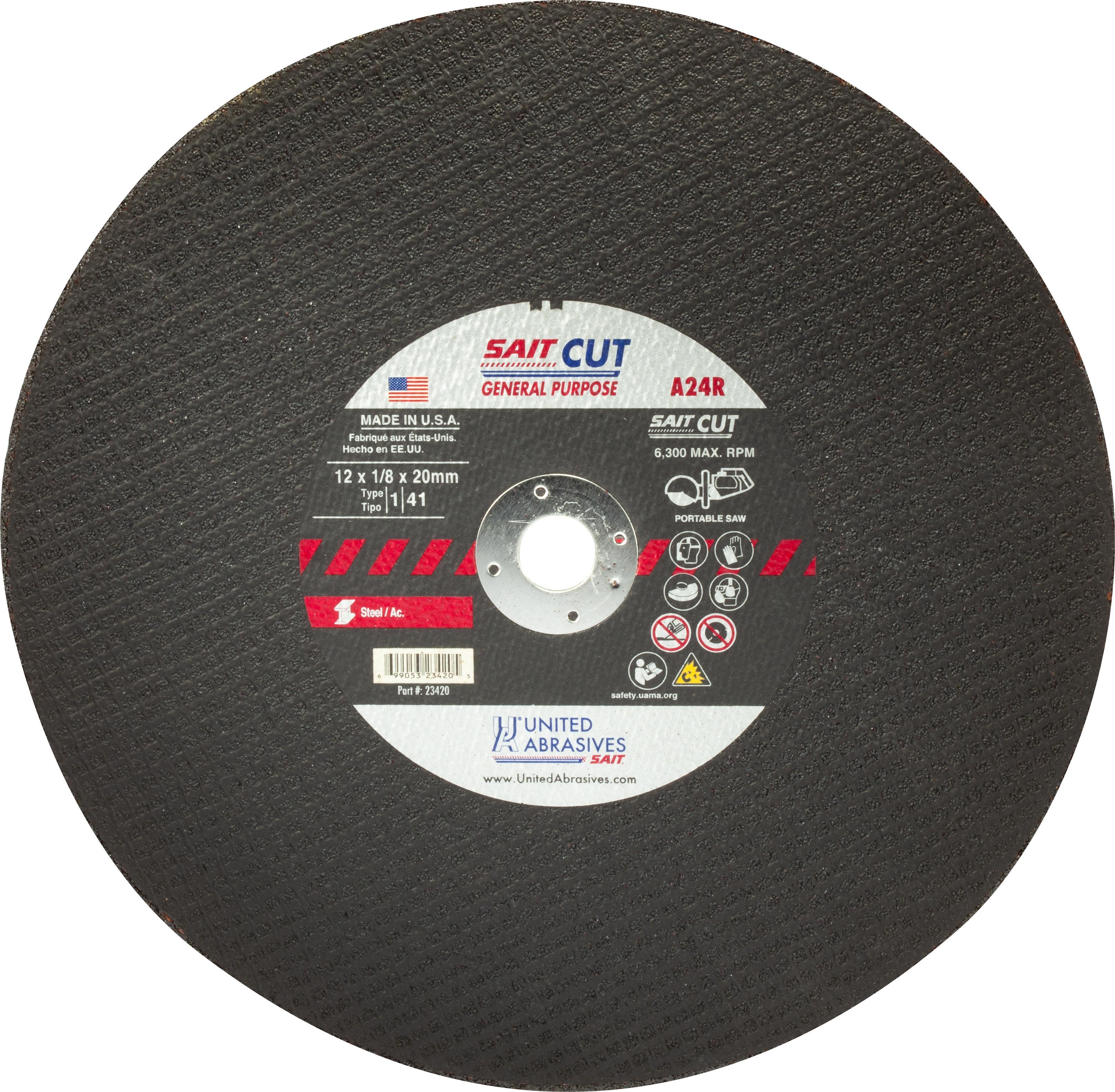 United Abrasives-SAIT 23410 Type 1 Burr Free Portable Saw Cut-Off Wheel, 12 in Dia x 1/8 in THK, 1 in Center Hole, A24R Grit, Aluminum Oxide Abrasive