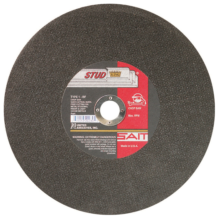 The United Abrasives/SAIT Stud King® Chop Saw Wheels are made for general purpose cool cutting on thin metals amd are composed of aluminum oxide grain. United Abrasives/SAIT wheels are constructed using the highest quality fiberglass to withstand the toughest applications. Proudly manufactured in the USA.