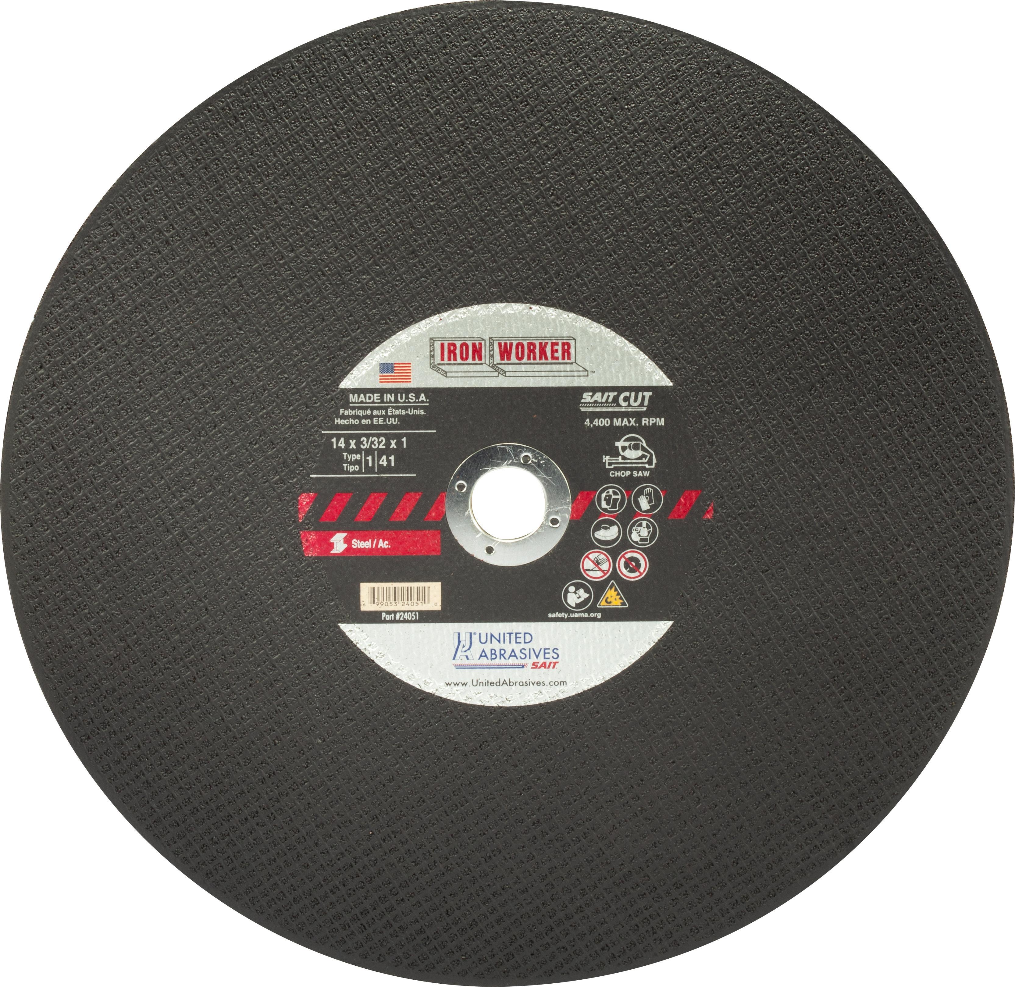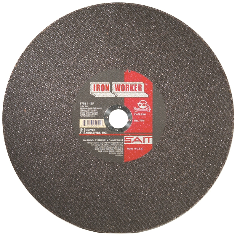 The United Abrasives/SAIT Type 1/Type 41 Iron Worker™ Chop Saw Wheel is a fast cutting, minimal pressure wheel that is excellent for use on angle iron, channel iron, heavy rebar and other ferrous metals. Proudly manufactured in the USA.