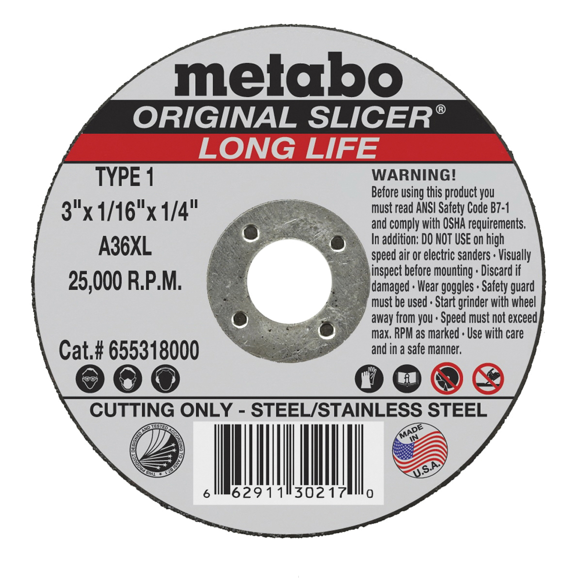 metabo® 655318000 Original Slicer Long Life Type 1 Straight Tough Cut-Off Wheel, 3 in Dia x 1/16 in THK, 1/4 in Center Hole, 36 Grit, Aluminum Oxide Abrasive