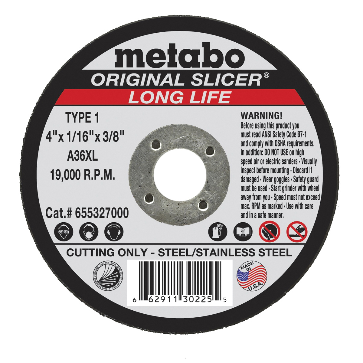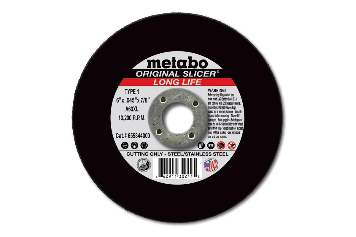 metabo® 655327000 Original Slicer Long Life Type 1 Straight Tough Cut-Off Wheel, 4 in Dia x 1/16 in THK, 3/8 in Center Hole, 36 Grit, Aluminum Oxide Abrasive
