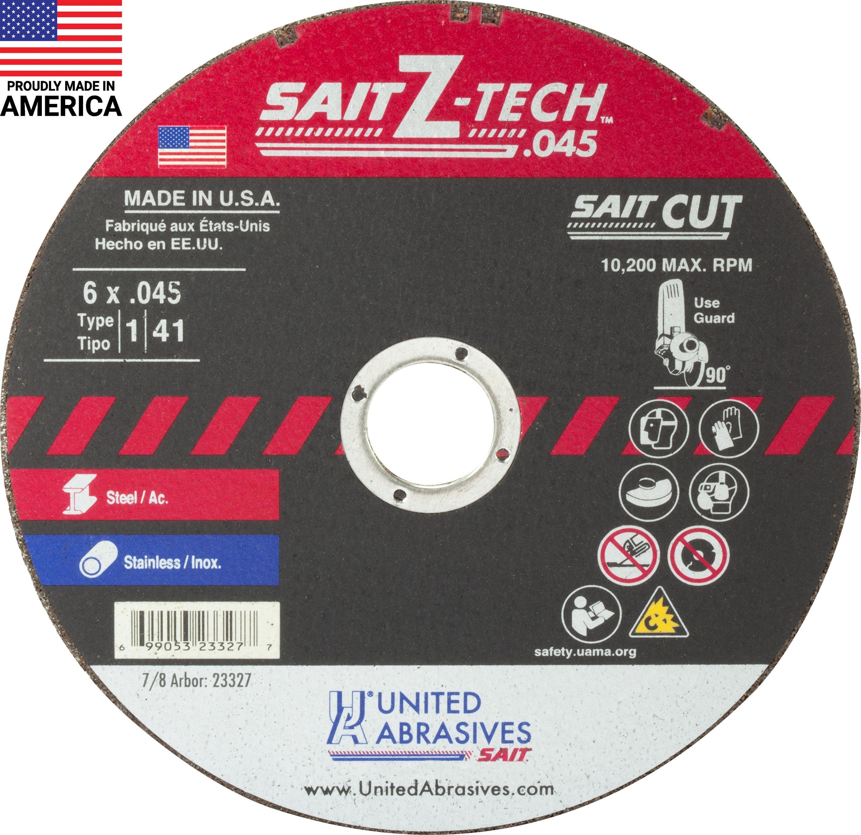 The United Abrasives-Sait .045" Z-Tech™ cutting wheel is a high performance wheel with a hard bond for an extremely long life and fast, burr-free cutting. The Z-Tech™ wheel is composed of special zirconium grain formula and is externally reinforced with fiberglass layers to provide ultimate safety in a thin wheel. Proudly manufactured in the USA.