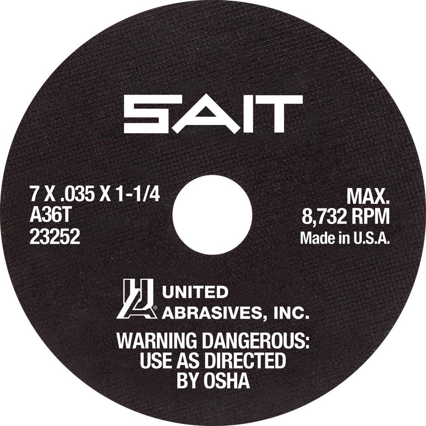 United Abrasives-SAIT 23250 Thin High Speed Cut-Off Wheel, 7 in Dia x 1/16 in THK, 1-1/4 in Center Hole, A36T Grit, Aluminum Oxide Abrasive