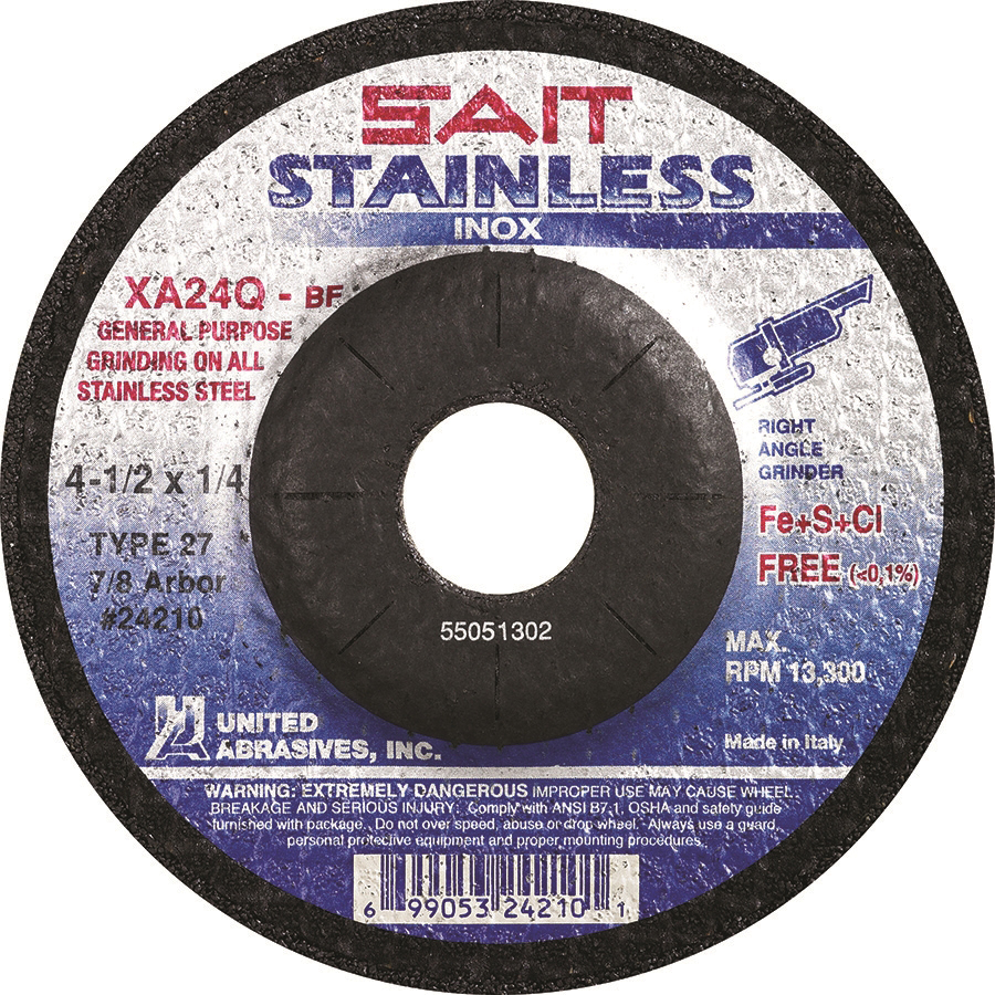 The United Abrasives/SAIT A24N grinding wheels are a great choice for fast stock removal. The A24N wheel is composed of a high quality aluminum oxide grain and reinforced with the highest quality fiberglass for maximum safety. Proudly manufactured in the USA.