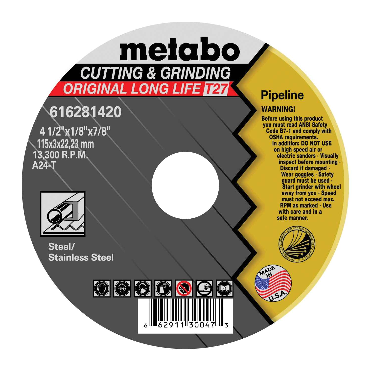 metabo® 616281420 Original Long Life Cutting & Grinding General Purpose Depressed Center Wheel, 4-1/2 in Dia x 1/8 in THK, 7/8 in Center Hole, A24T Grit, Aluminum Oxide Abrasive