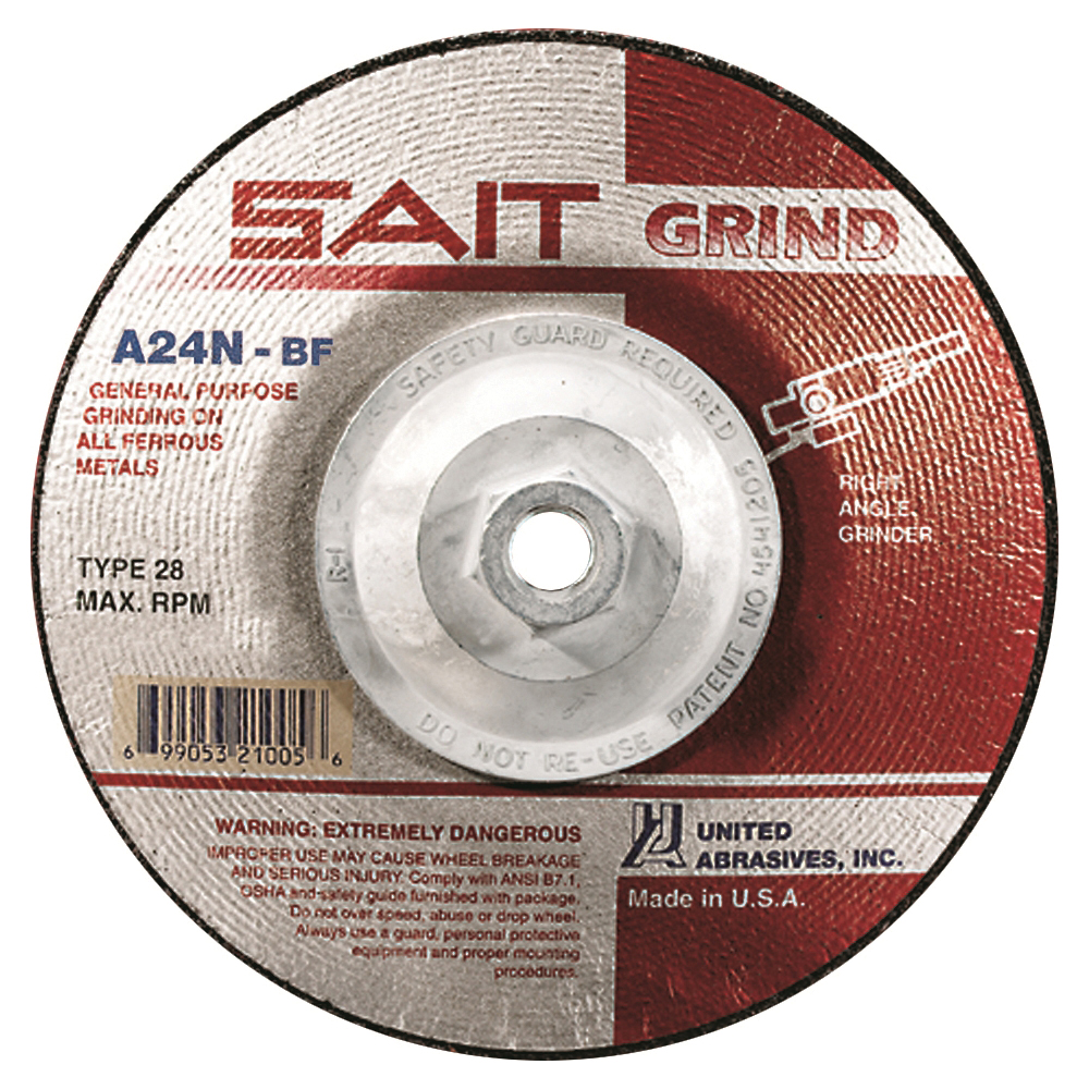 The United Abrasives/SAIT A24N grinding wheels are a great choice for fast stock removal. The A24N wheel is composed of a high quality aluminum oxide grain and reinforced with the highest quality fiberglass for maximum safety. Proudly manufactured in the USA.