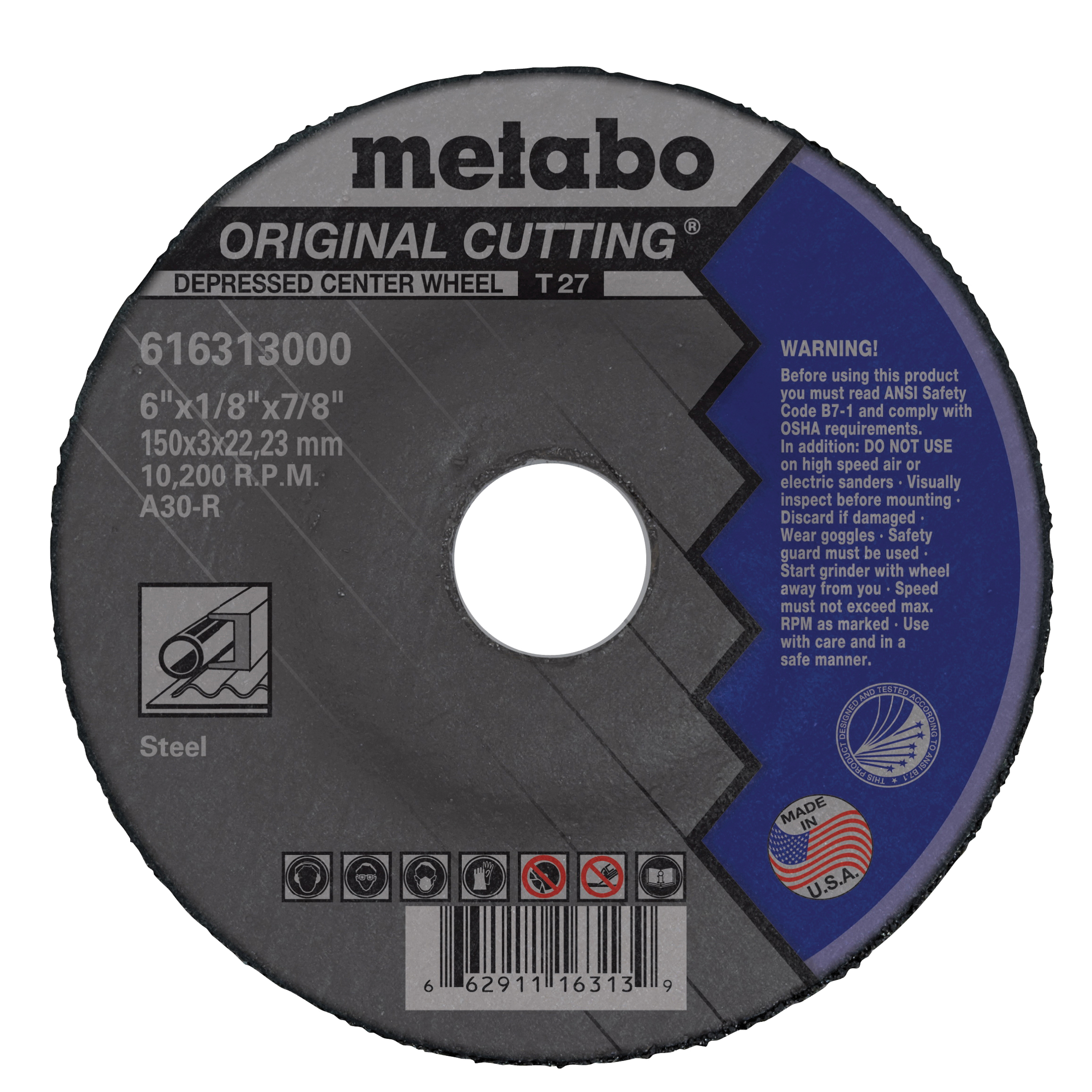 metabo® 616313000 Original Cutting® General Purpose Depressed Center Wheel, 6 in Dia x 1/8 in THK, 7/8 in Center Hole, A30R Grit, Aluminum Oxide Abrasive