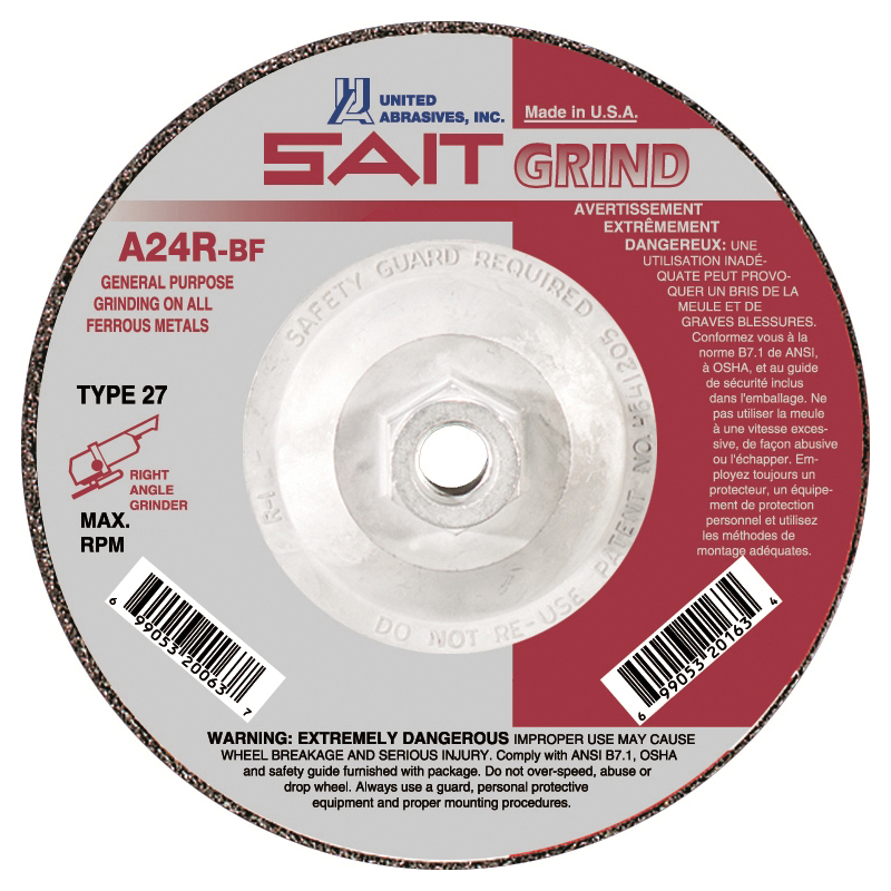 The United Abrasives/SAIT A24N grinding wheels are a great choice for fast stock removal. The A24N wheel is composed of a high quality aluminum oxide grain and reinforced with the highest quality fiberglass for maximum safety. Proudly manufactured in the USA.