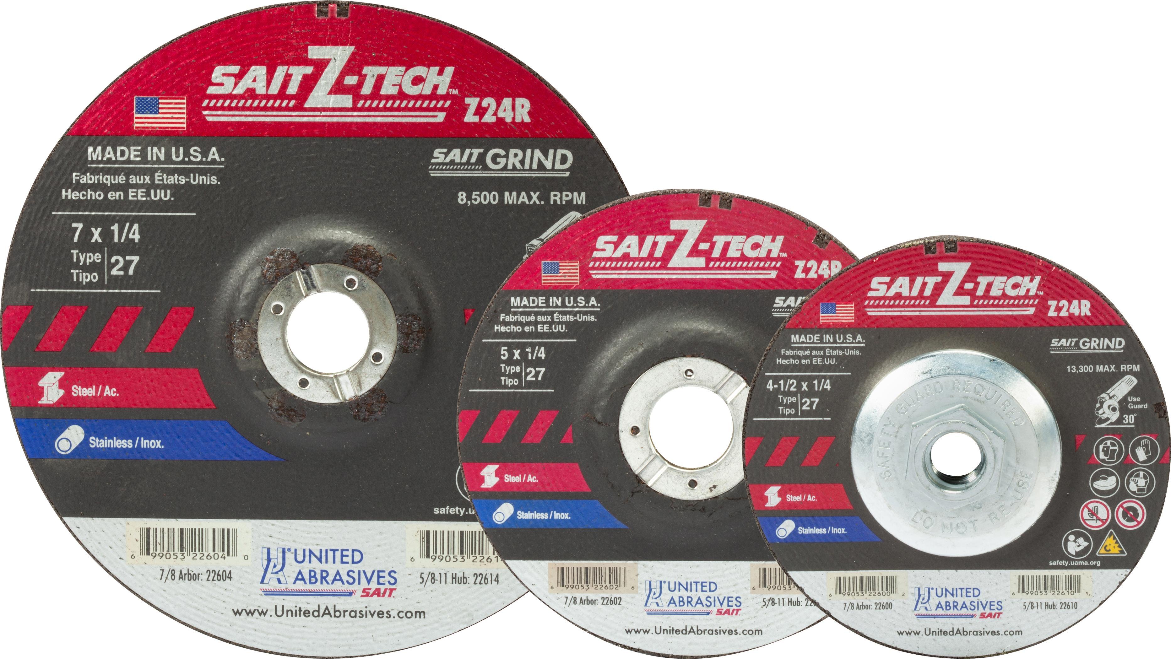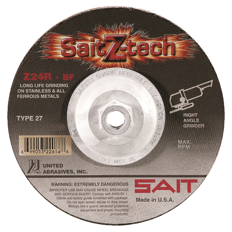The United Abrasives/SAIT Sait Z-Tech™ grinding wheels offer high performance grinding for the toughest applications. The Z-Tech™ grinding wheels are composed of tough zirconium grain and internally reinforced with the highest quality fiberglass for maximum safety. Proudly manufactured in the USA.