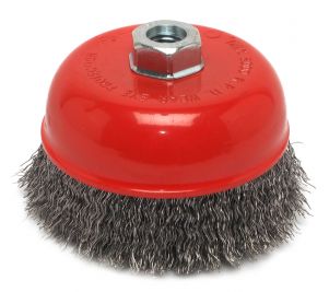 CUP BRUSH, CRIMPED WIRE 5" X .012" WIRE WITH 5/8" -11 ARBOR-FOR72754 >