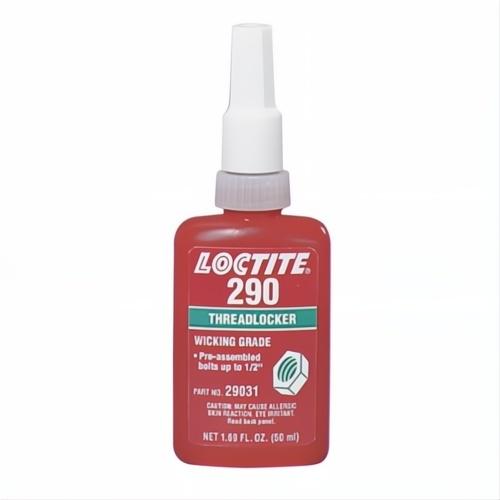 LOCTITE® 290 is a liquid medium/high-strength thread locker designed for the locking and sealing of threaded fasteners. Because of its low viscosity and capillary action, the product wicks between engaged threads and eliminates the need for disassembly prior to application. The product cures when confined in the absence of air between close-fitting metal surfaces and prevents loosening and leakage due to shock and vibration. The product can also fill porosities in welds, castings and powdered metal parts.
