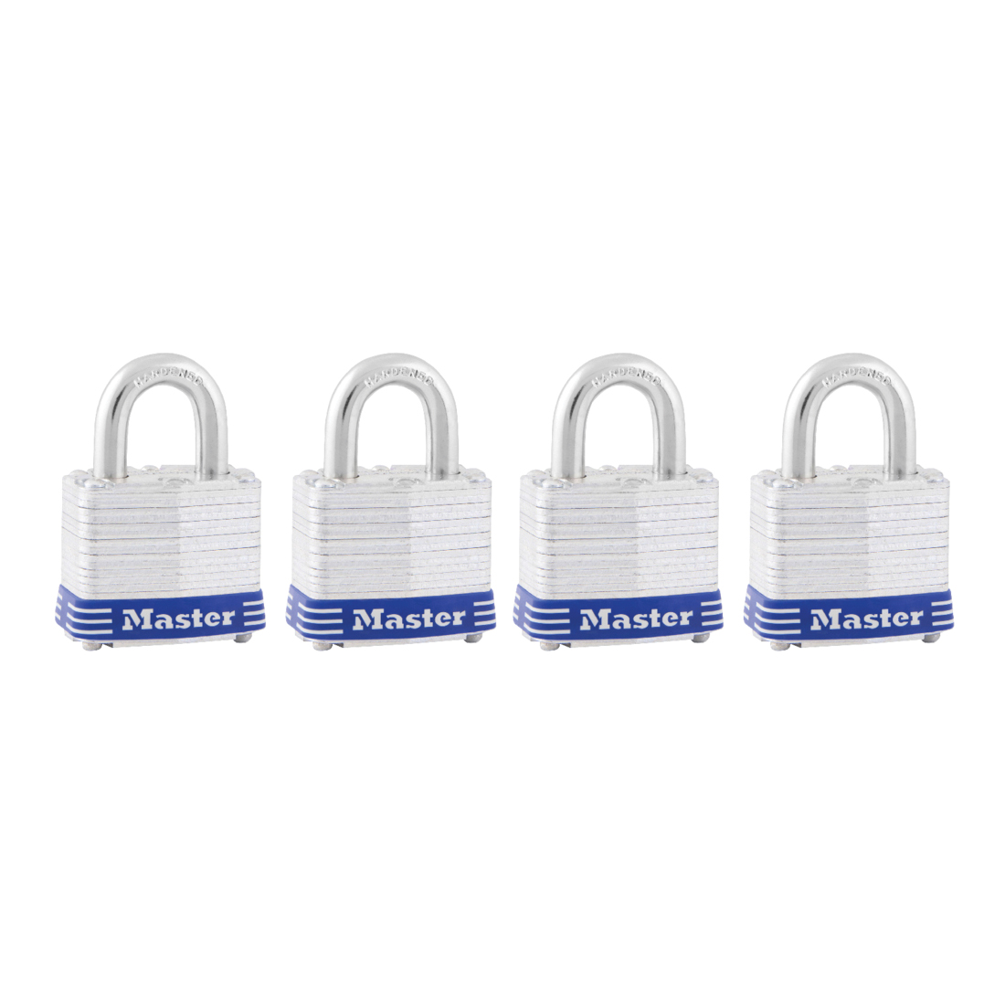 Laminated steel padlock. 4-pack of No. 3 keyed alike. 9/32 in (7 mm) Dia, 3/4 in (19 mm) high, 5/8 in (16 mm) wide shackle. 1-9/16 in (40 mm) wide laminated steel body for superior strength. Hardened steel shackles for extra cut resistance. Non-rekeyable, 4-pin tumbler cylinder helps prevent picking. Dual locking levers provide extra pry resistance. Retail carded packaging, shelf pack quantity 4, master carton quantity 16.