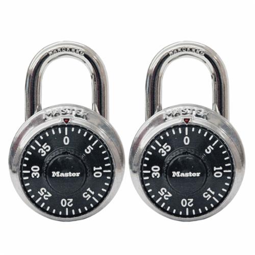 Black dial combination padlocks. 2-pack of No. 1500 combination alike. World's best selling combination lock. 1-7/8 in (48 mm) wide durable stainless steel lock body. 9/32 in (7 mm) Dia, 3/4 in (19 mm) high, 13/16 in (21 mm) wide shackle. 3-digital dialing and 1500 combinations for maximum security. Hardened steel shackle for extra cut resistance. Retail carded packaging, shelf pack quantity 4, master carton quantity 16.