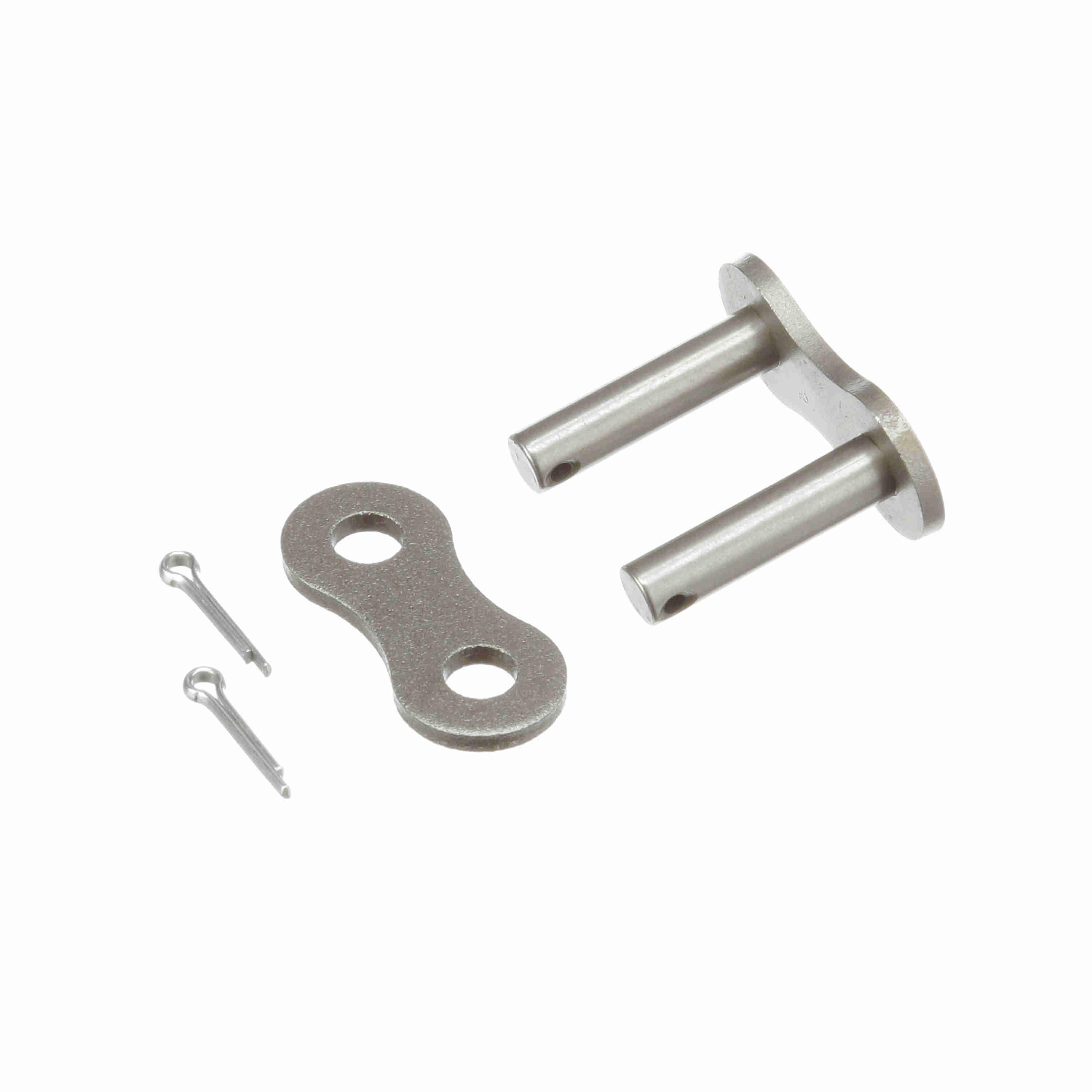 Connecting link standard has a removable plate with a slip fit on the pins which allows easy assembly and disassembly. Depending on pitch this may be furnished with spring clip or cotter keys.