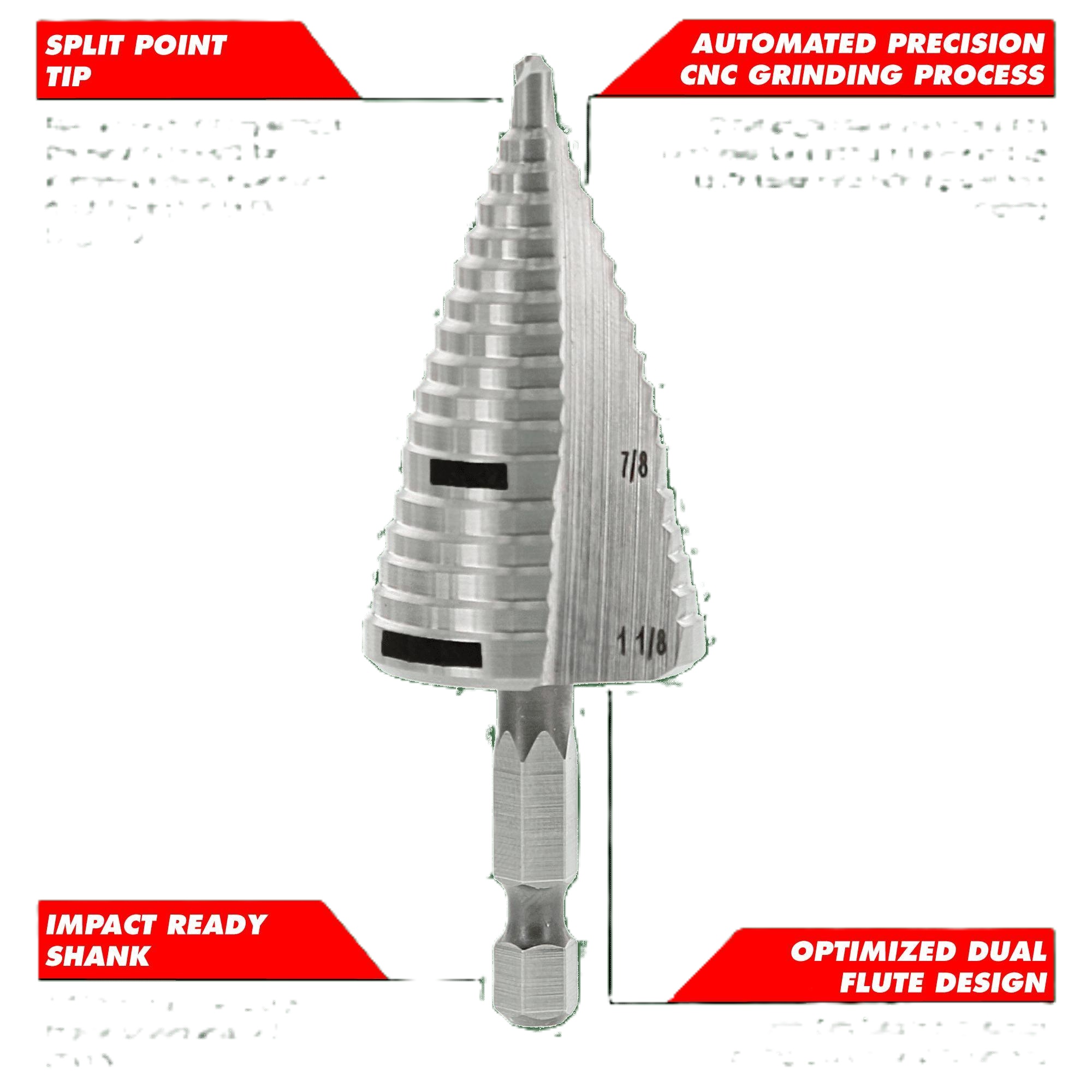 Includes1/4 in to 1/2 in Impact Step Drill Bit DSD0500S06, 3/8 in to 7/8 in Impact Step Drill Bit DSD0875S12, 7/8 in to 1-1/8 in Impact Step Drill Bit DSD1125S17