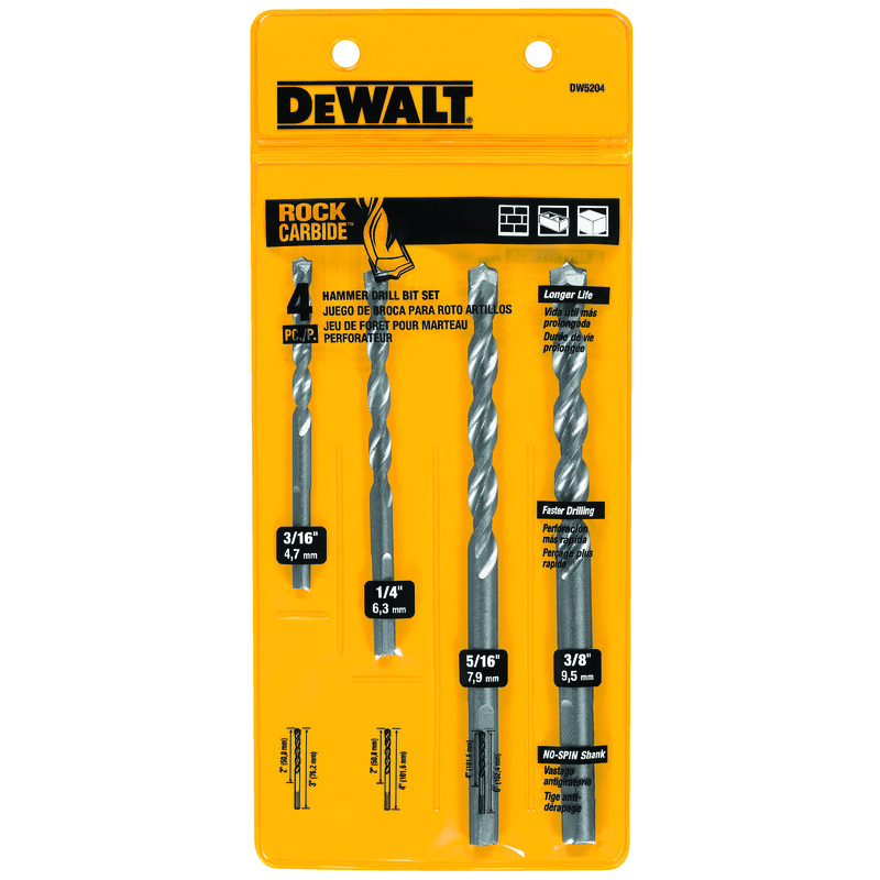 DeWALT® Guaranteed Tough® DW5204 Premium Percussion Hammer Drill Bit Set, 3/16 in Min Drill Bit, 3/8 in Max Drill Bit, 4 Pieces, For Use With All Brands Electric and Cordless Hammer Drills Including DeWALT®, Bosch® and Hilti®, Carbide Tip, Bright