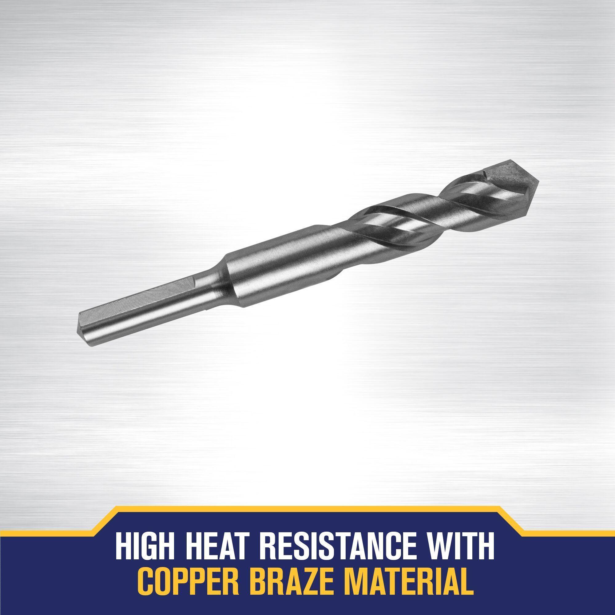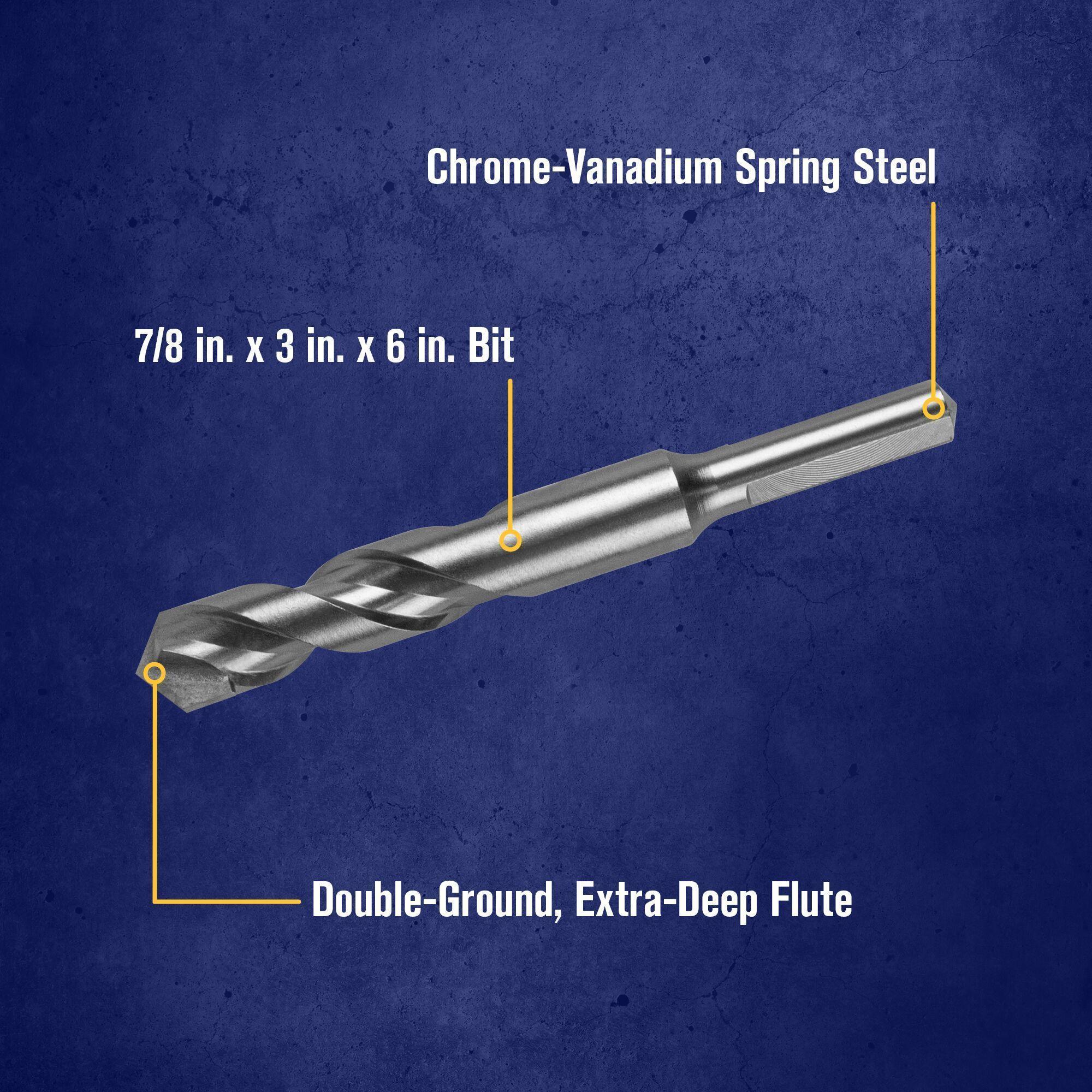 Built to withstand demanding materials, the 7/8 in. x 3 in. x 6 in. Rotary Percussion Drill Bit is made of copper braze material for high heat resistance. The chrome-vanadium spring steel shaft adds durability for extended bit lifetime and the double-ground, extra-deep flute removes debris fast for increased visibility. This bit works in hammer drills with a 3-jaw or Jacobs chuck.