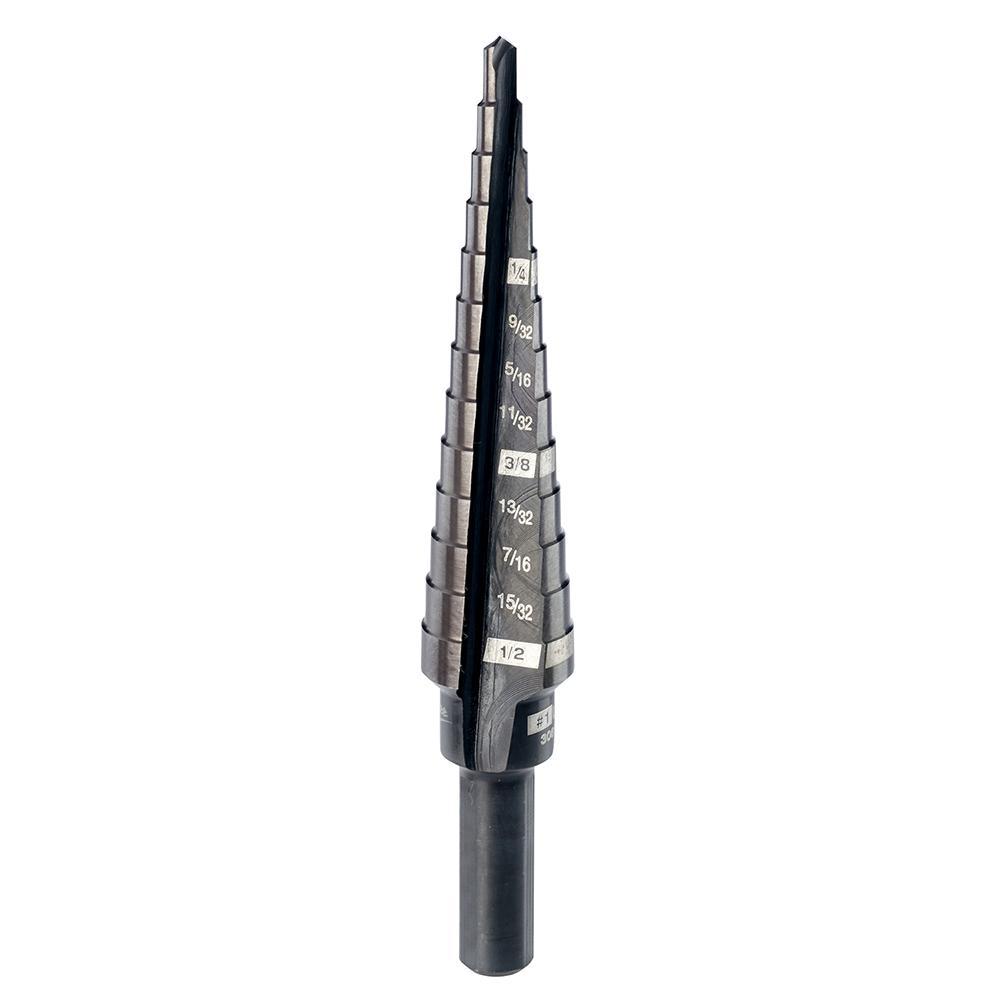 Milwaukee® step drill bits with jam-free performance feature a dual-flute design delivering up to 2X faster hole times, up to 4X longer life and up to 50% more holes per battery charge than the competition. Ideal for drilling large and small-diameter holes in steel and plastic, these bits are optimized for cordless drills in high speed. The Rapid Strike™ tip allows for fast, accurate starts that generate less heat, resulting in longer bit tip life. Black oxide coating also enhances durability, hole quality and bit life. For user convenience and accuracy, each bit has laser-engraved reference marks you can see while drilling. The 3-flat Secure-Grip™ shank ensures a solid connection with the drill chuck. The #1 step drill bit has 13 hole sizes in 1/32 in. increments ranging from 1/8 in. to 1/2 in.. jam-free performance in high speed with most professional 18 Volt cordless drills lithium-ion battery technology.
