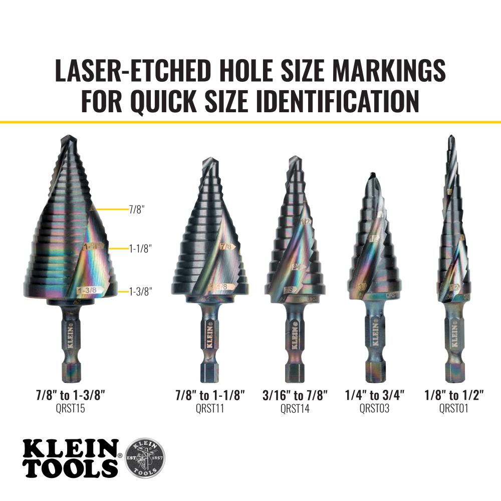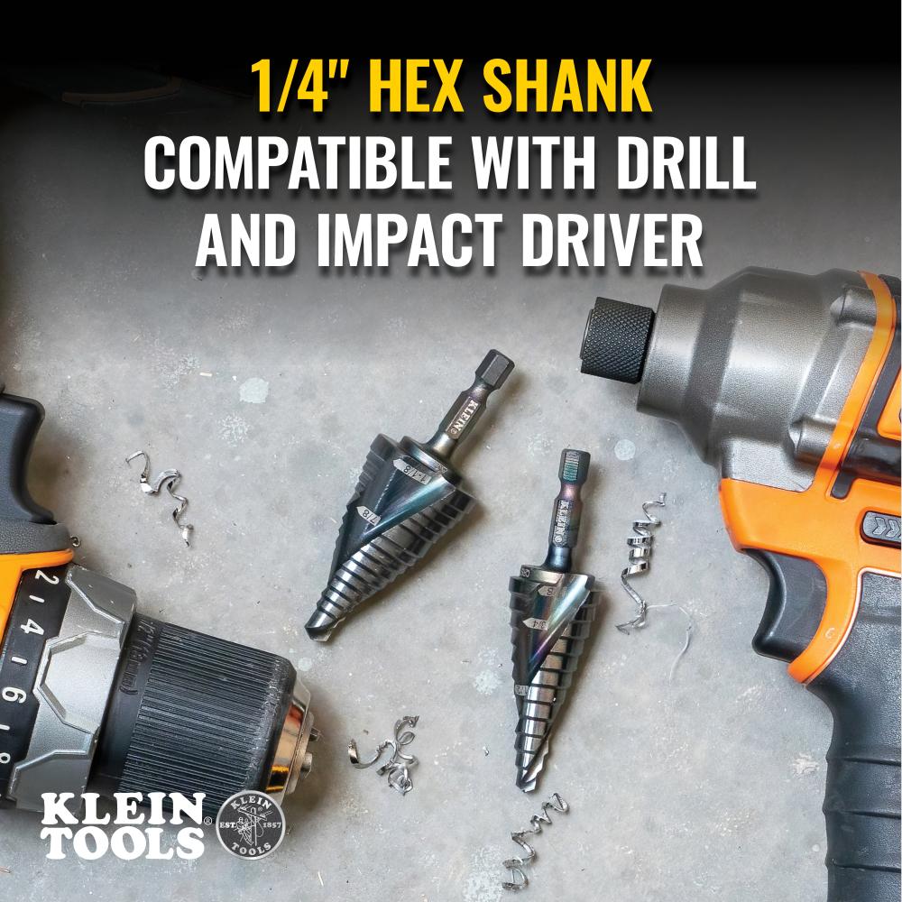The dual spiral flutes on Klein Step Drill Bits help pull the step bit through the material for faster cutting. The aluminum titanium coating is 10 times more durable than steamed black oxide for longer bit life. Impact rated, the 1/4-Inch hex shank provides a firm, positive grip and allows quick and convenient usage with an impact driver and a drill. Three hole sizes with laser marking for easy identification.