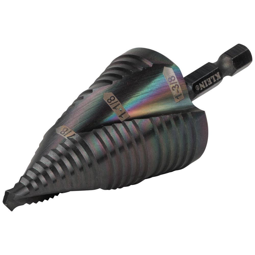 KleinĀ® QRST15 Quick Release Step Drill Bit, 7/8 in Dia Min Hole, 1-3/8 in Dia Max Hole, 3 Steps, 3 Hole Sizes, 1/4 in Shank
