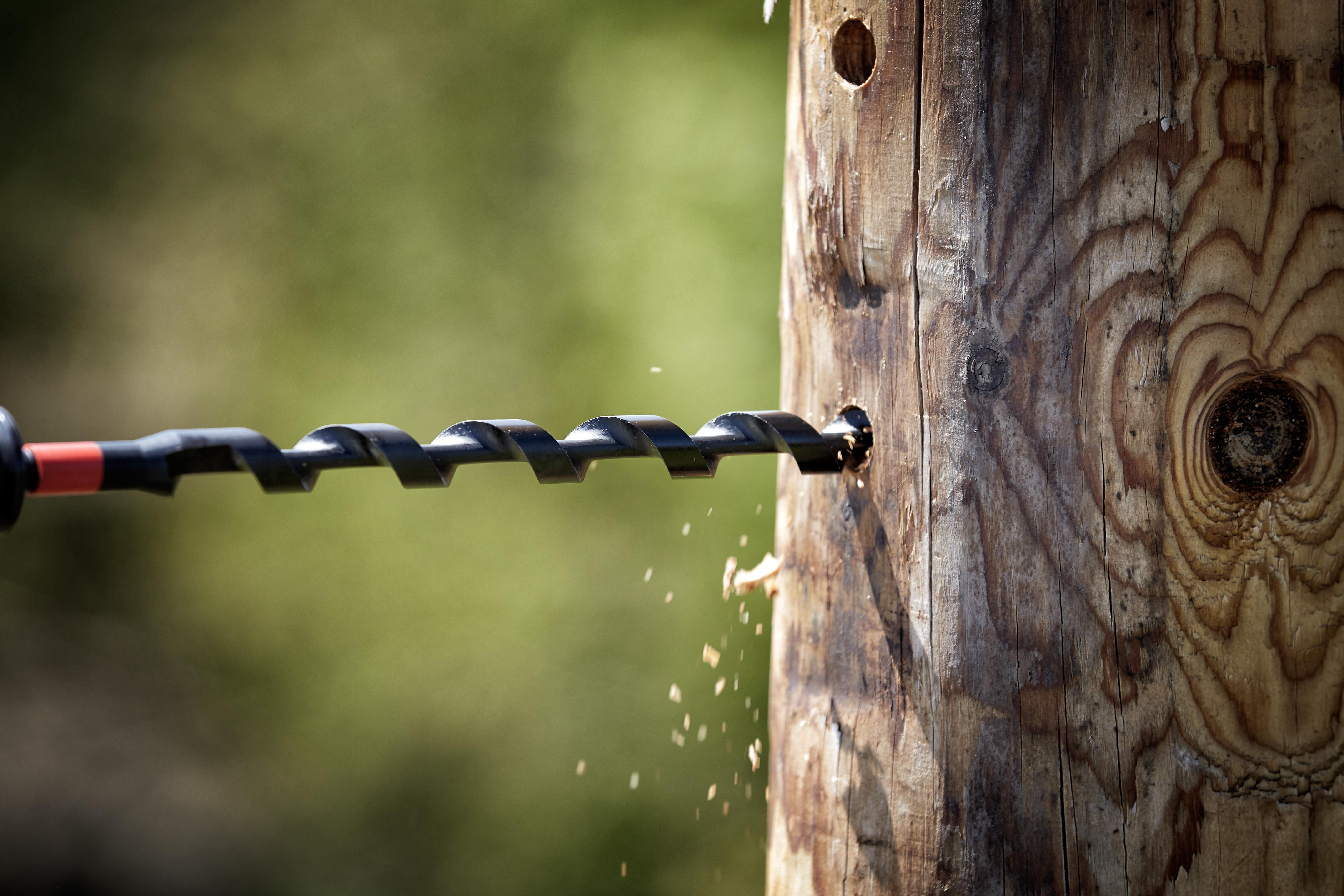 The SHOCKWAVE™ lineman's impact auger bits are engineered to deliver cleaner, faster holes in wooden utility poles. They feature a single spur design, which scores the edge of the hole, creating a cleaner finish that allows bolts to slide through without resistance. The bits are coated with a reinforced anti-friction PTFE coating for overall smoother drilling and easier removal of the bit from the pole. The aggressive feed screw and cutting edge pull the bit through the material while the optimized wide flute geometry quickly ejects the chips to clear the hole and reduce clogs, leading to overall faster drilling speeds.