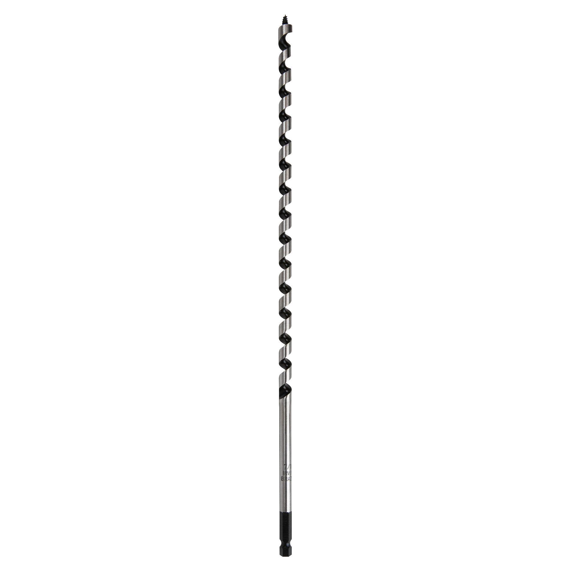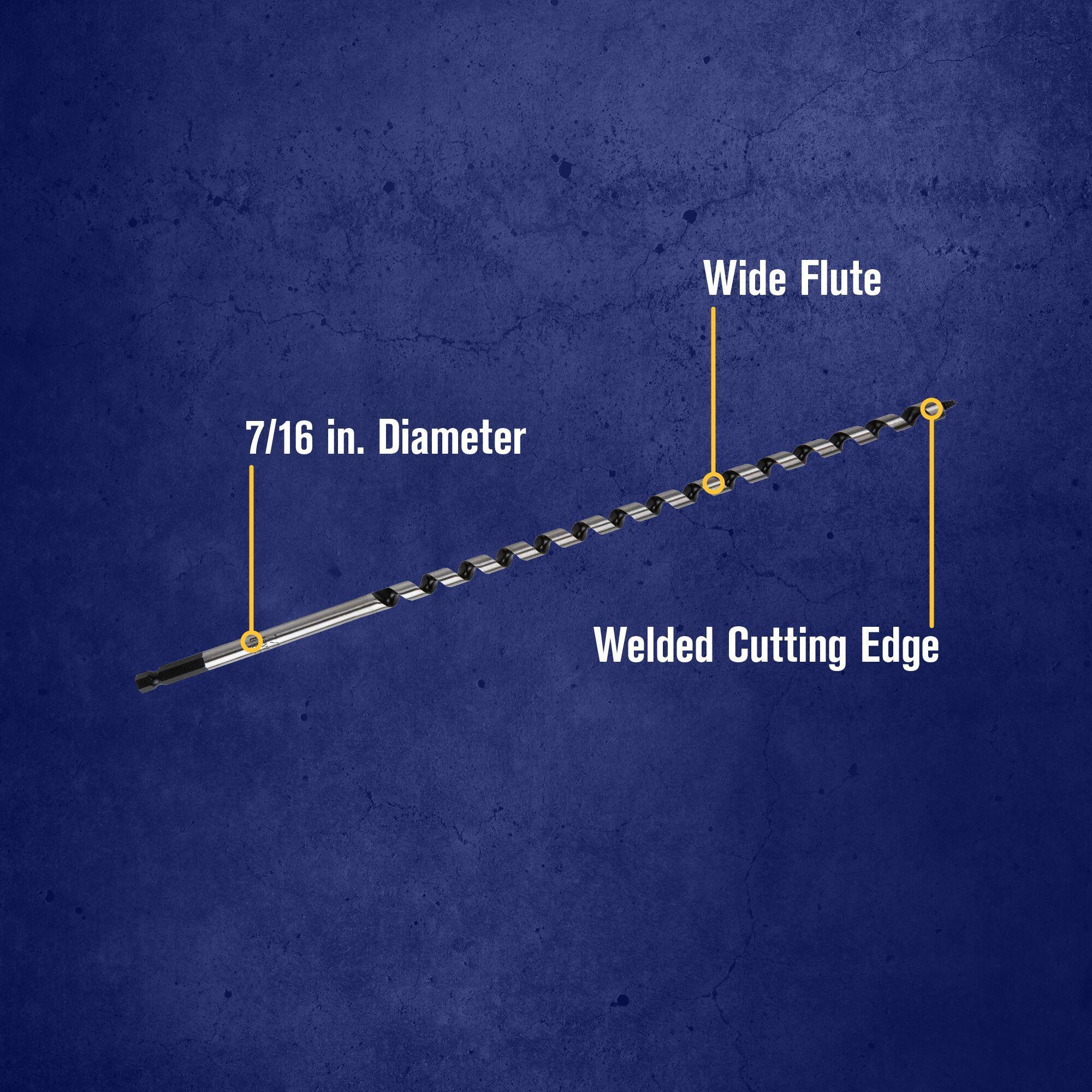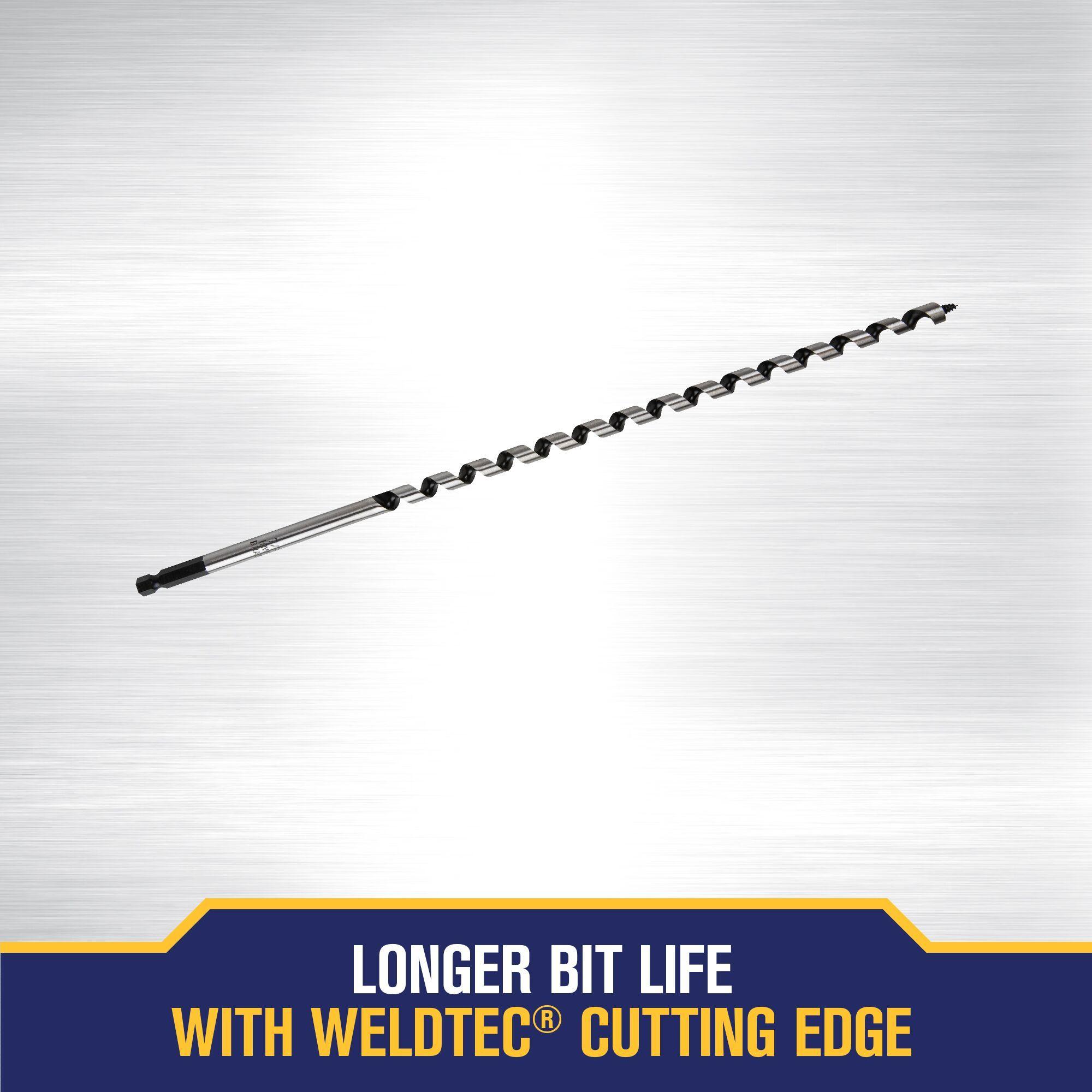 The IRWIN WeldTec 7/16-inch Auger Bit features a hard cutting edge that is welded to the base material for improved strength and durability. The welded cutting edge on each WeldTec auger drill bit provides an extended cutting life. Wide flutes and a 7/16-inch quick-change impact shank provide added versatility.