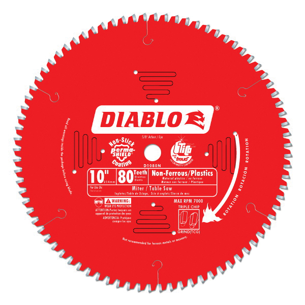 Diablo® specialty non-ferrous plastics thin kerf blade has a triple chip grind (TCG) tooth design for long life and a clean, burr-free finish. Diablo® blade is ideal for on-the-job cutting of nonferrous metal such as copper pipe, aluminum extrusions, brass plate, etc.